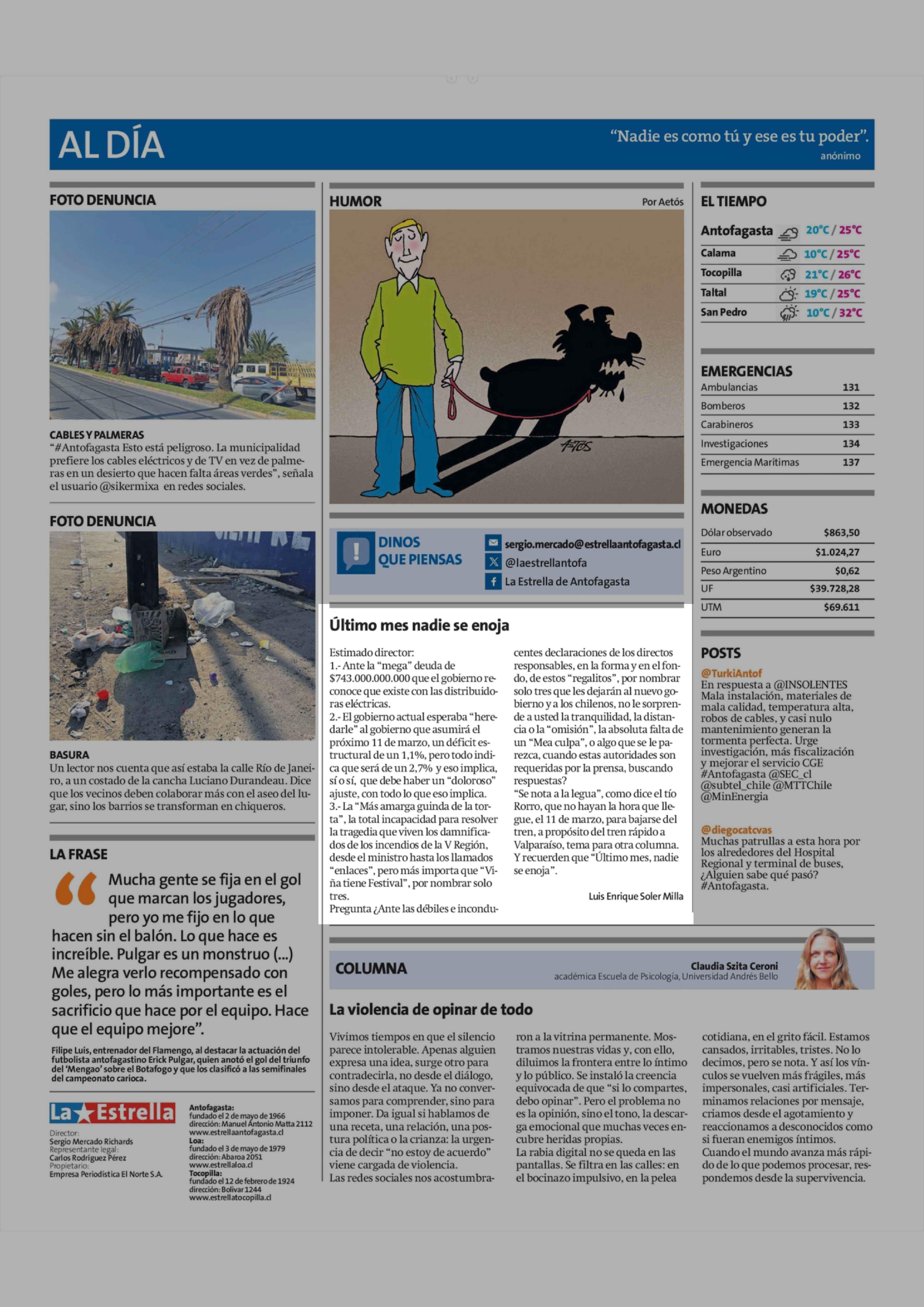 Columnas de Opinión: Último mes nadie se enoja 17-02-2026 La Estrella de Antofagasta |