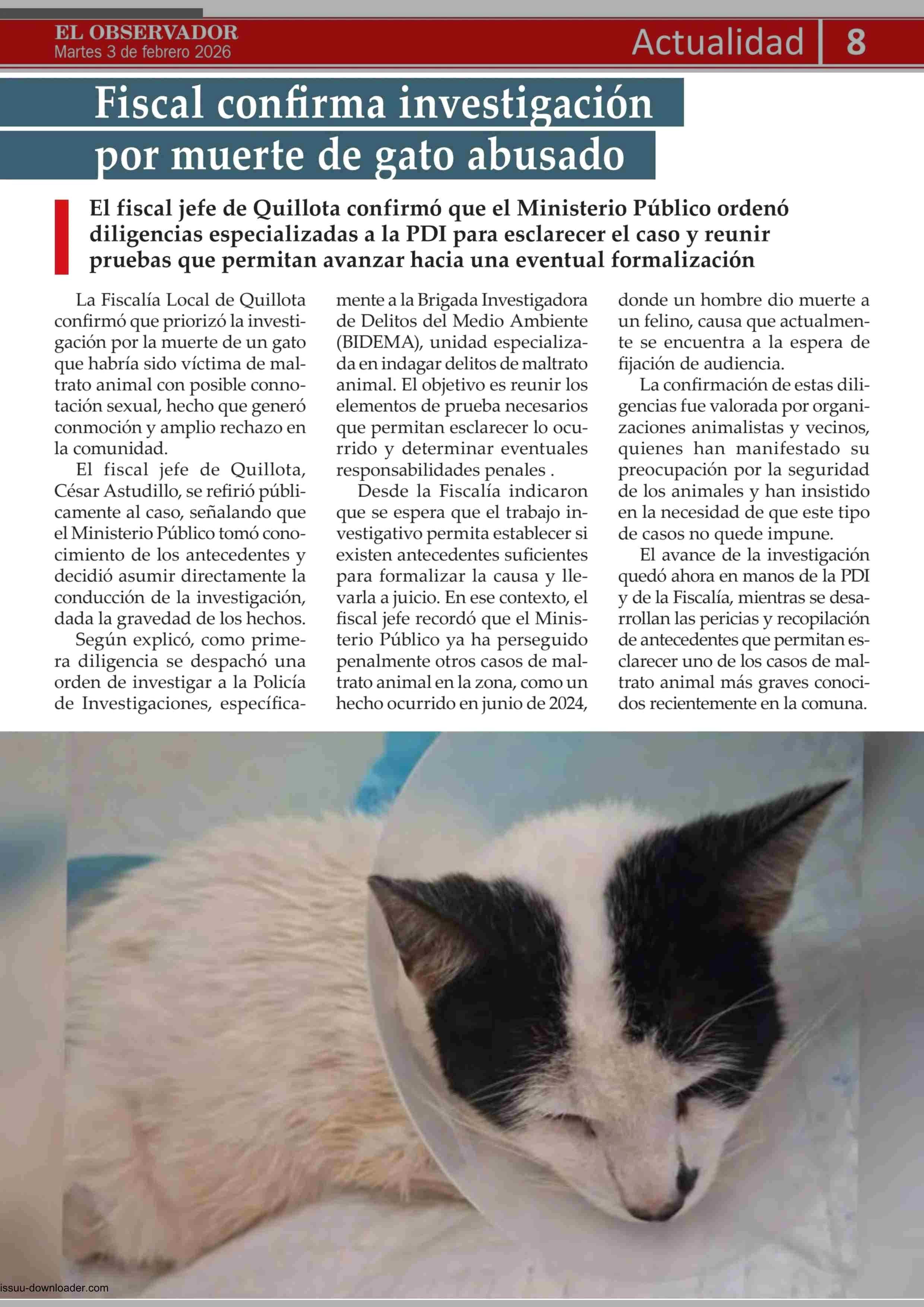 Fiscal confirma investigación por muerte de gato abusado 03-02-2026 El Observador Vespertino |