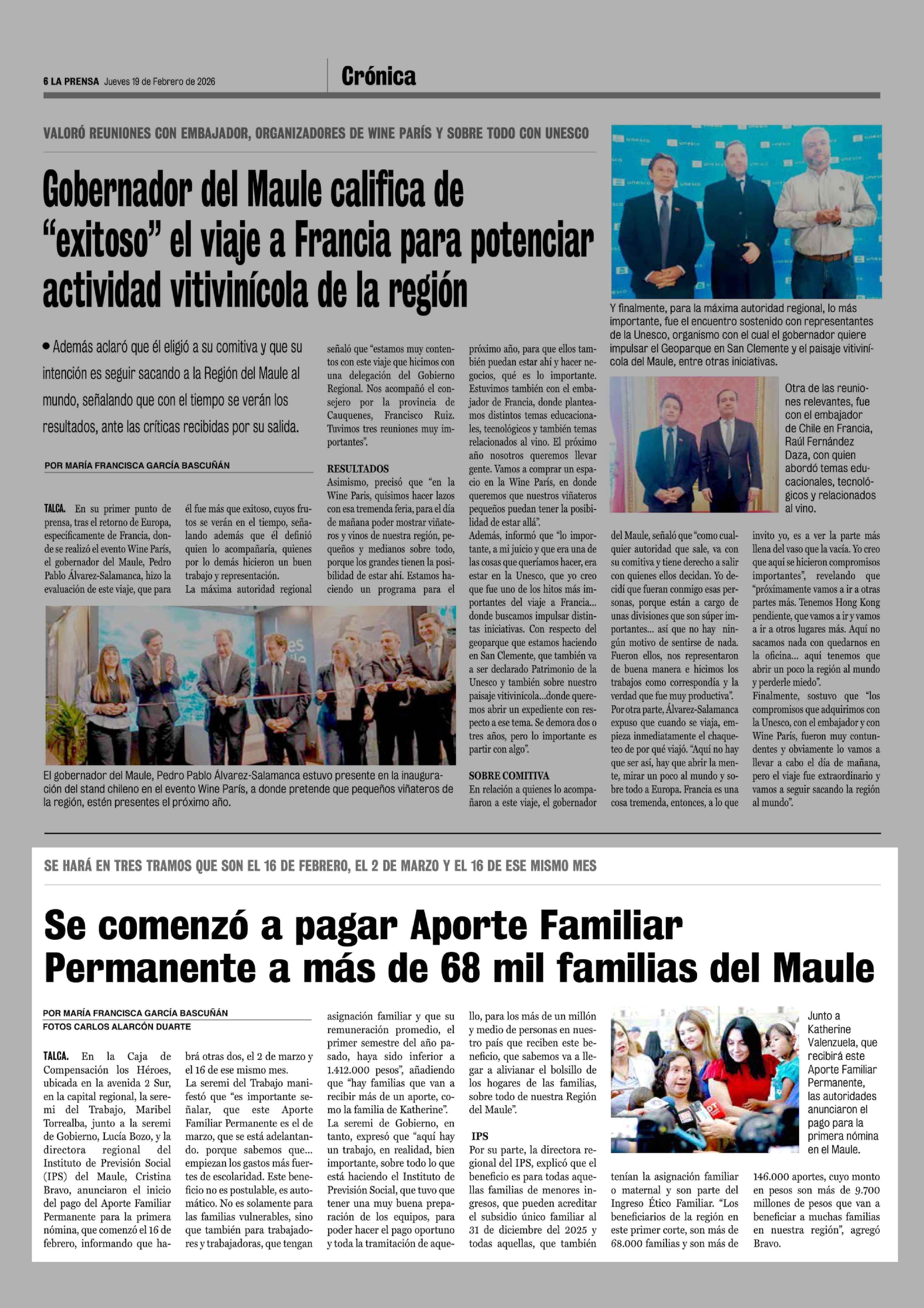 Se comenzó a pagar Aporte Familiar Permanente a más de 68 mil familias del Maule 19-02-2026 La Prensa de Curicó |
