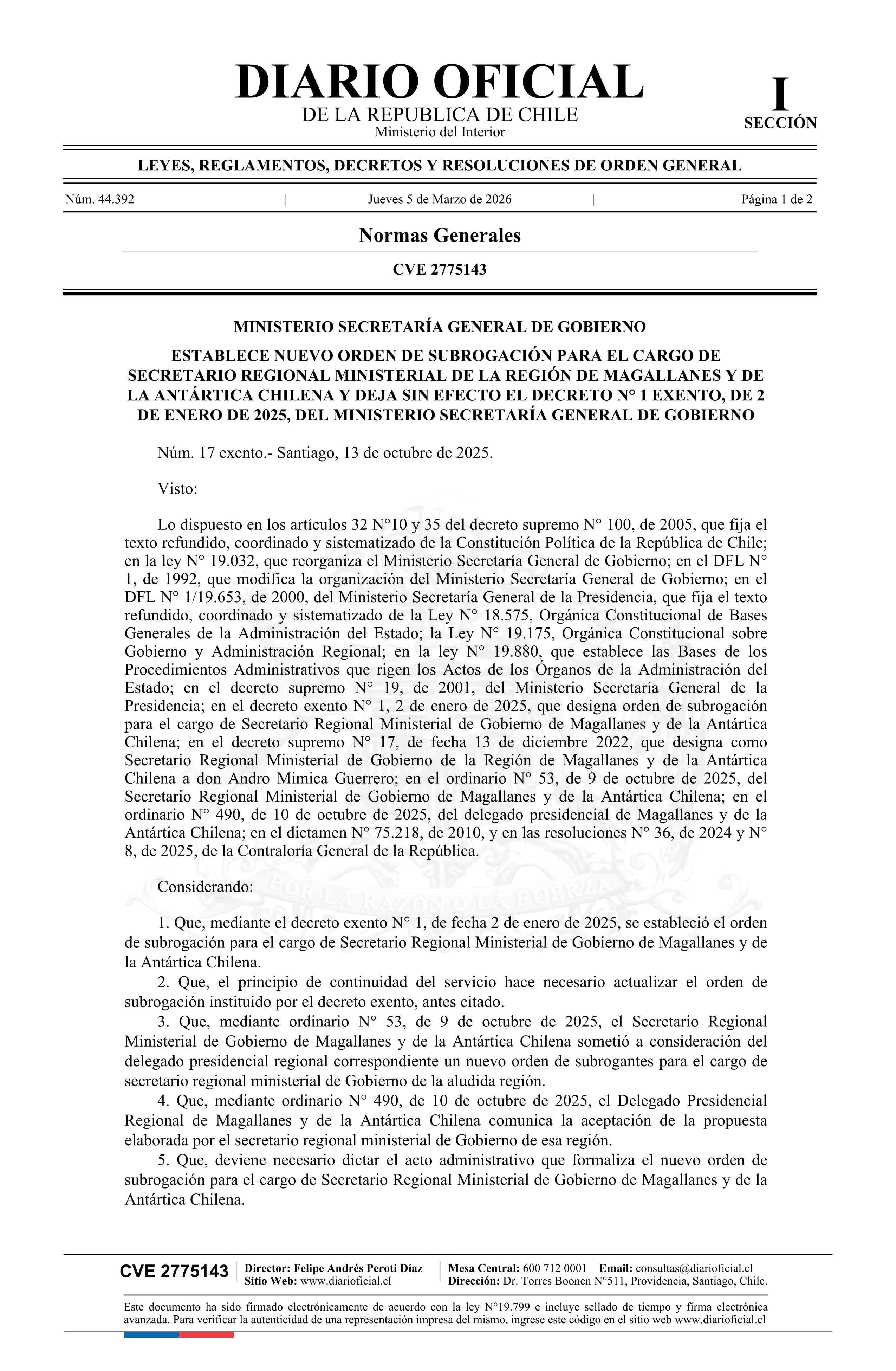Título: Decreto exento número 17, de 2025.- Establece nuevo orden de subrogación para el cargo de Secretario Regional Ministerial de la Región de Magallanes y de la Antártica Chilena y deja sin efecto el decreto N° 1 exento, de 2025