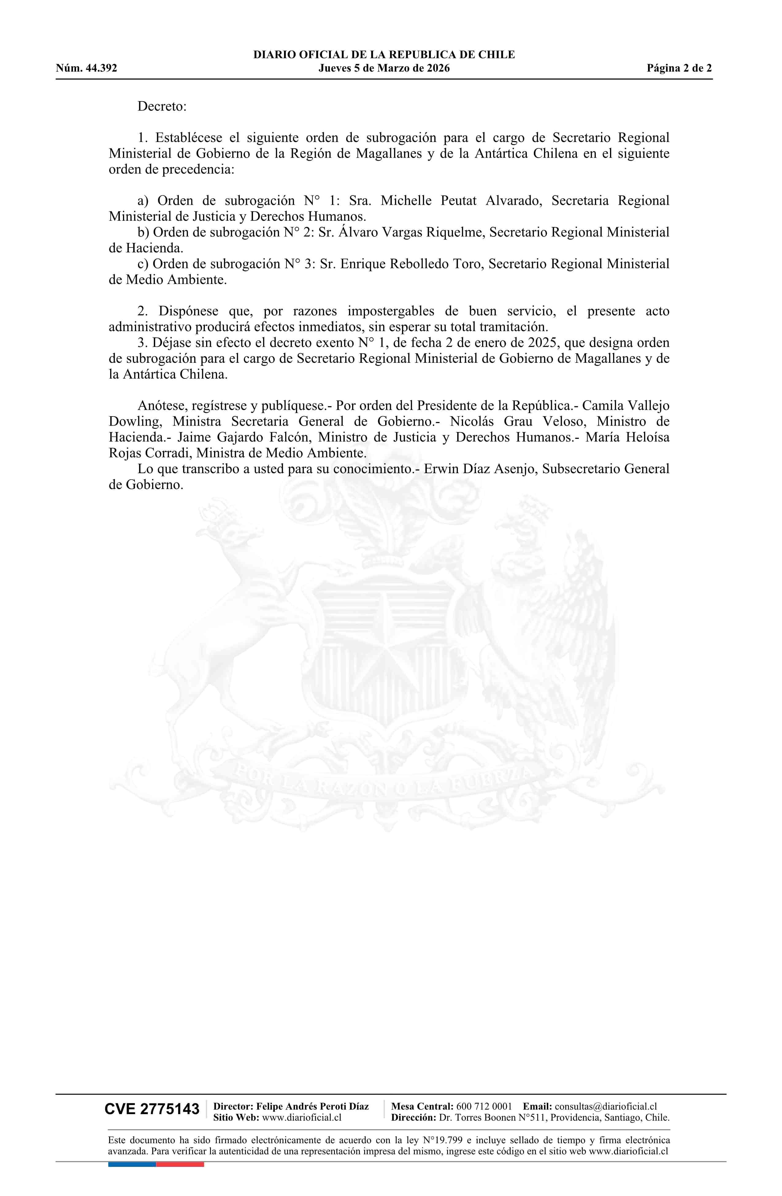 Decreto exento número 17, de 2025.- Establece nuevo orden de subrogación para el cargo de Secretario Regional Ministerial de la Región de Magallanes y de la Antártica Chilena y deja sin efecto el decreto N° 1 exento, de 2025