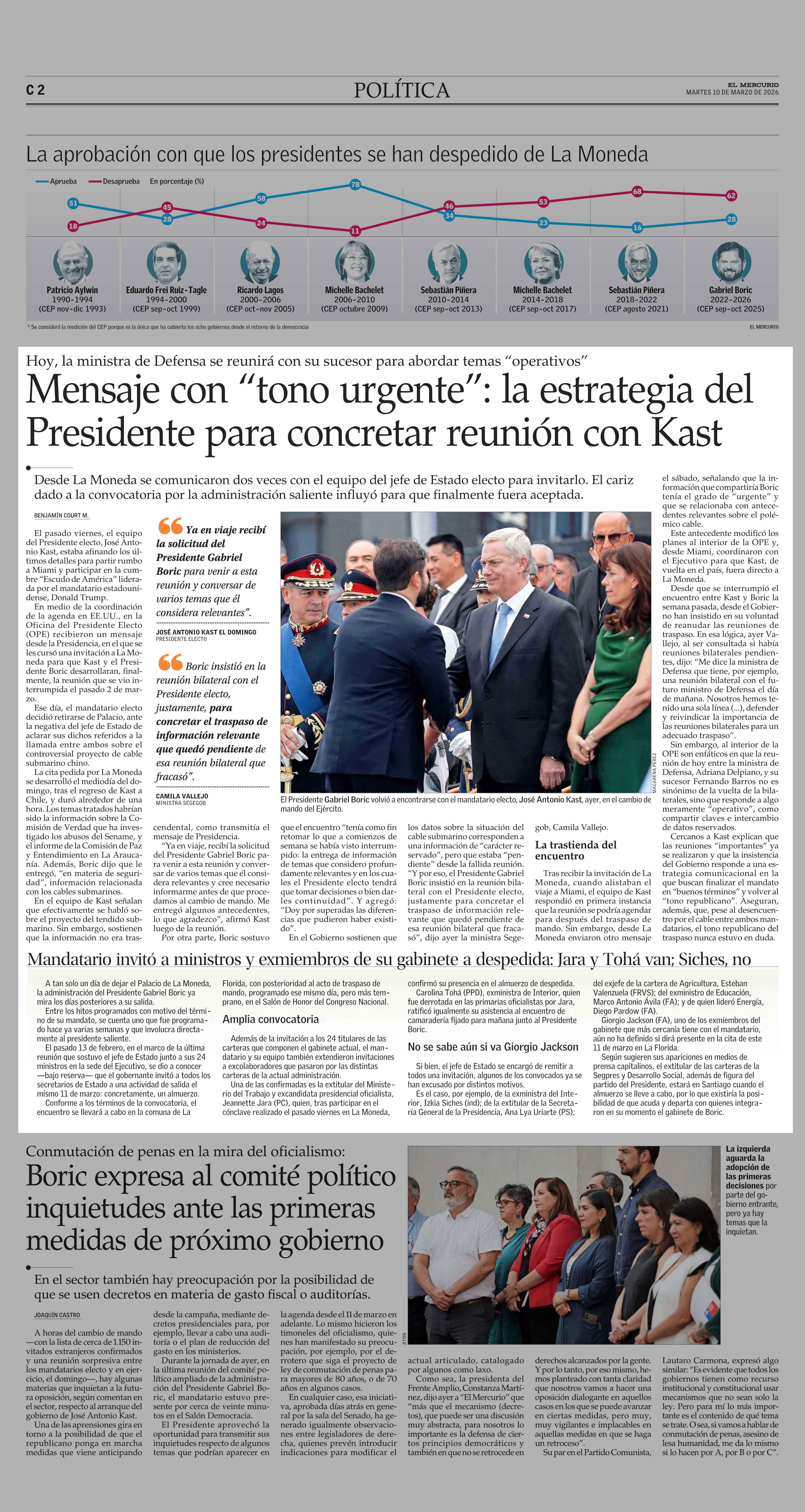 Mensaje con “tono urgente”: la estrategia del Presidente para concretar reunión con Kast 10-03-2026 El Mercurio |