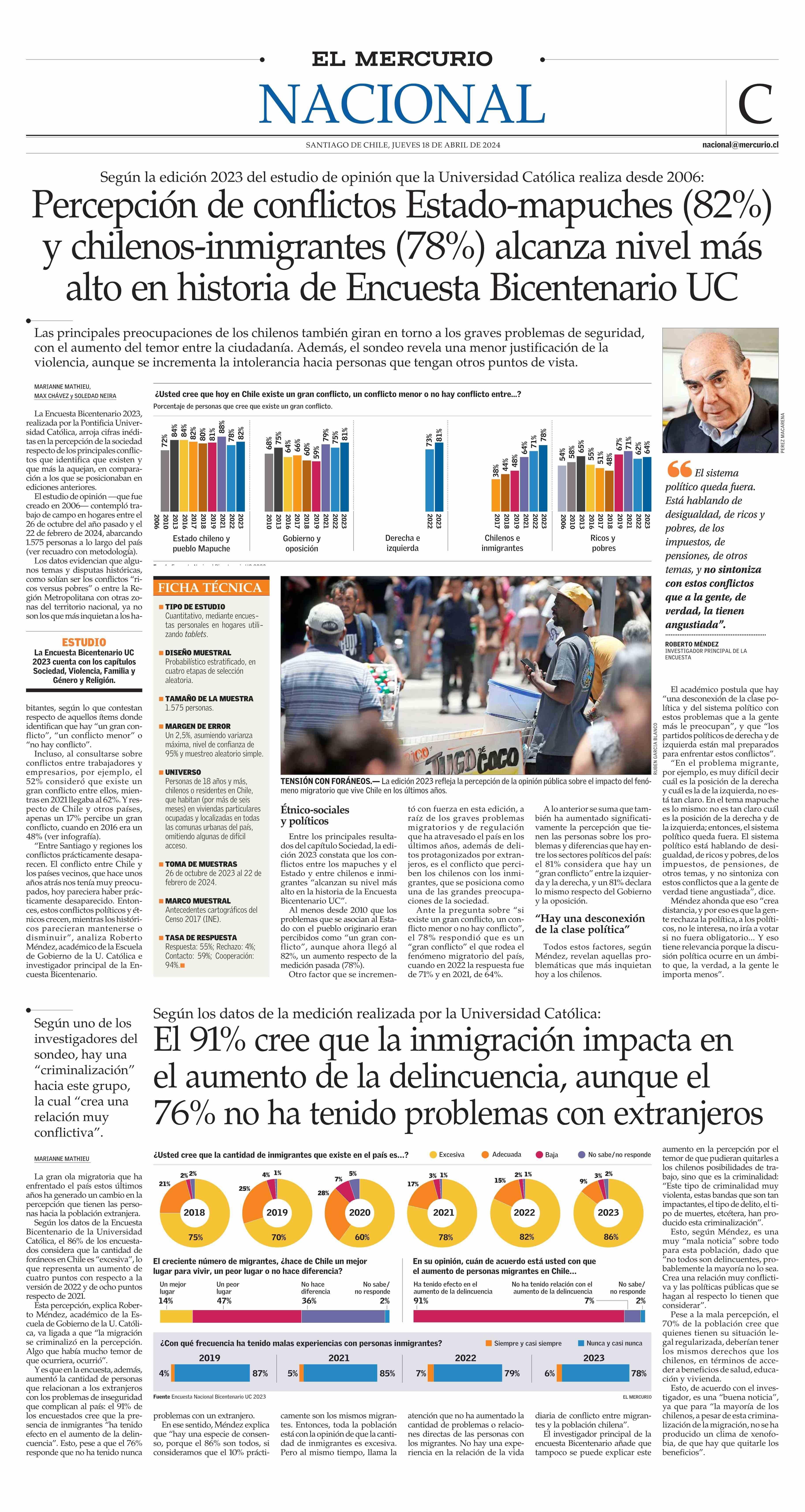 Percepción de conflictos Estado-mapuches (82%) y chilenos-inmigrantes (78%) alcanza nivel más alto en historia de Encuesta Bicentenario UC 18-04-2024 El Mercurio |