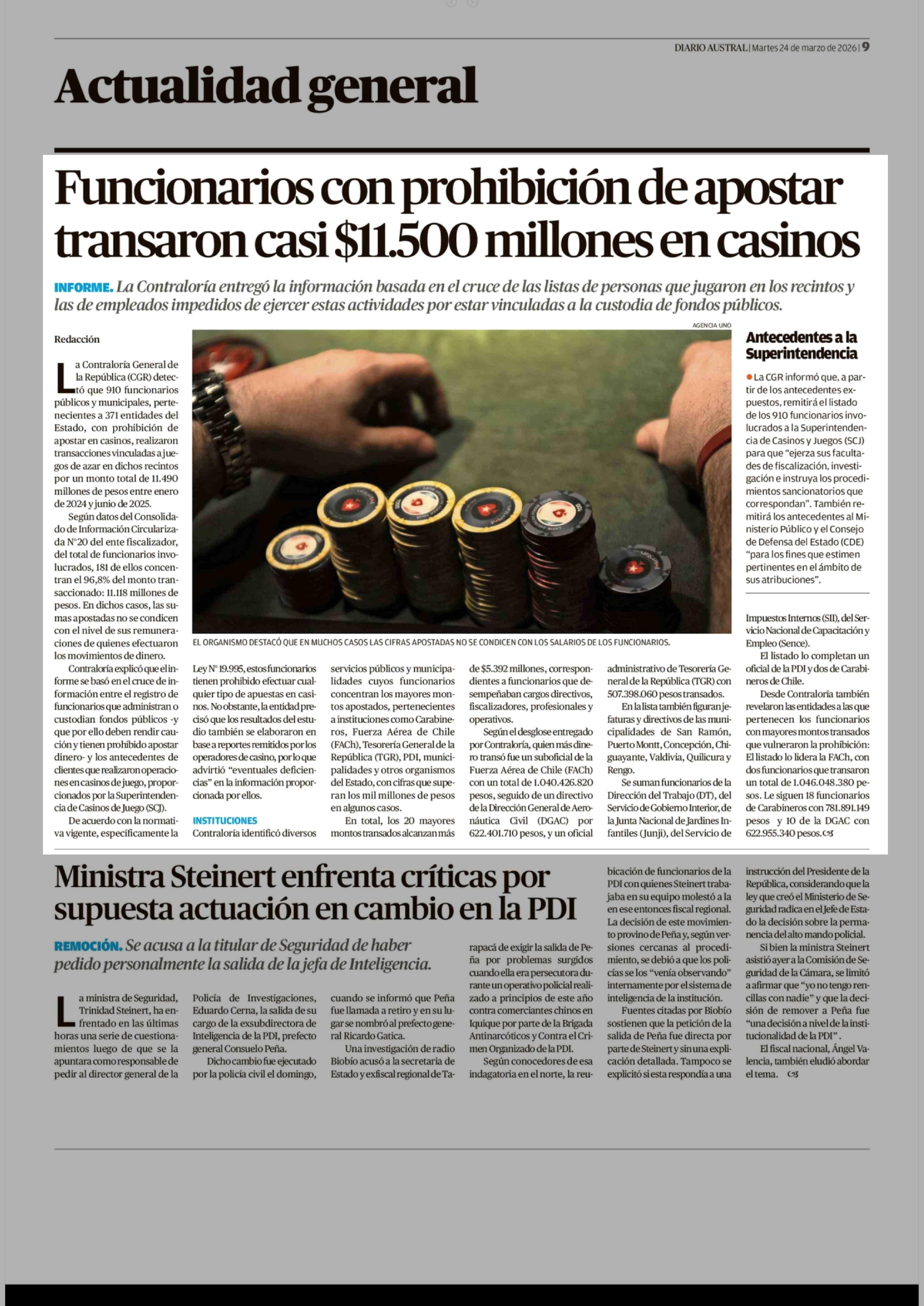 Funcionarios con prohibición de apostar transaron casi $11.500 millones en casinos 24-03-2026 Diario Austral Región de Los Ríos |
