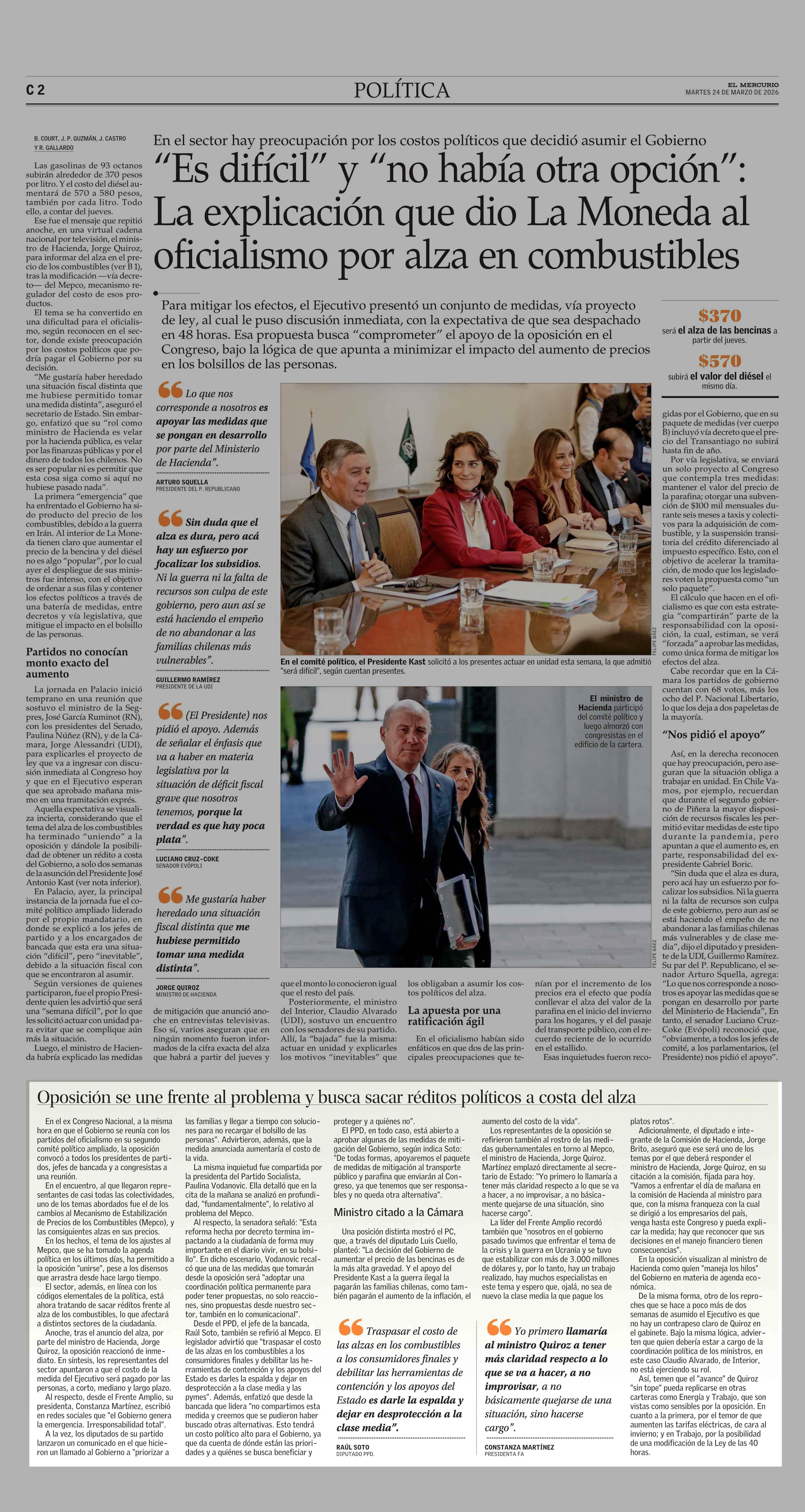 Oposición se une frente al problema y busca sacar réditos políticos a costa del alza 24-03-2026 El Mercurio |