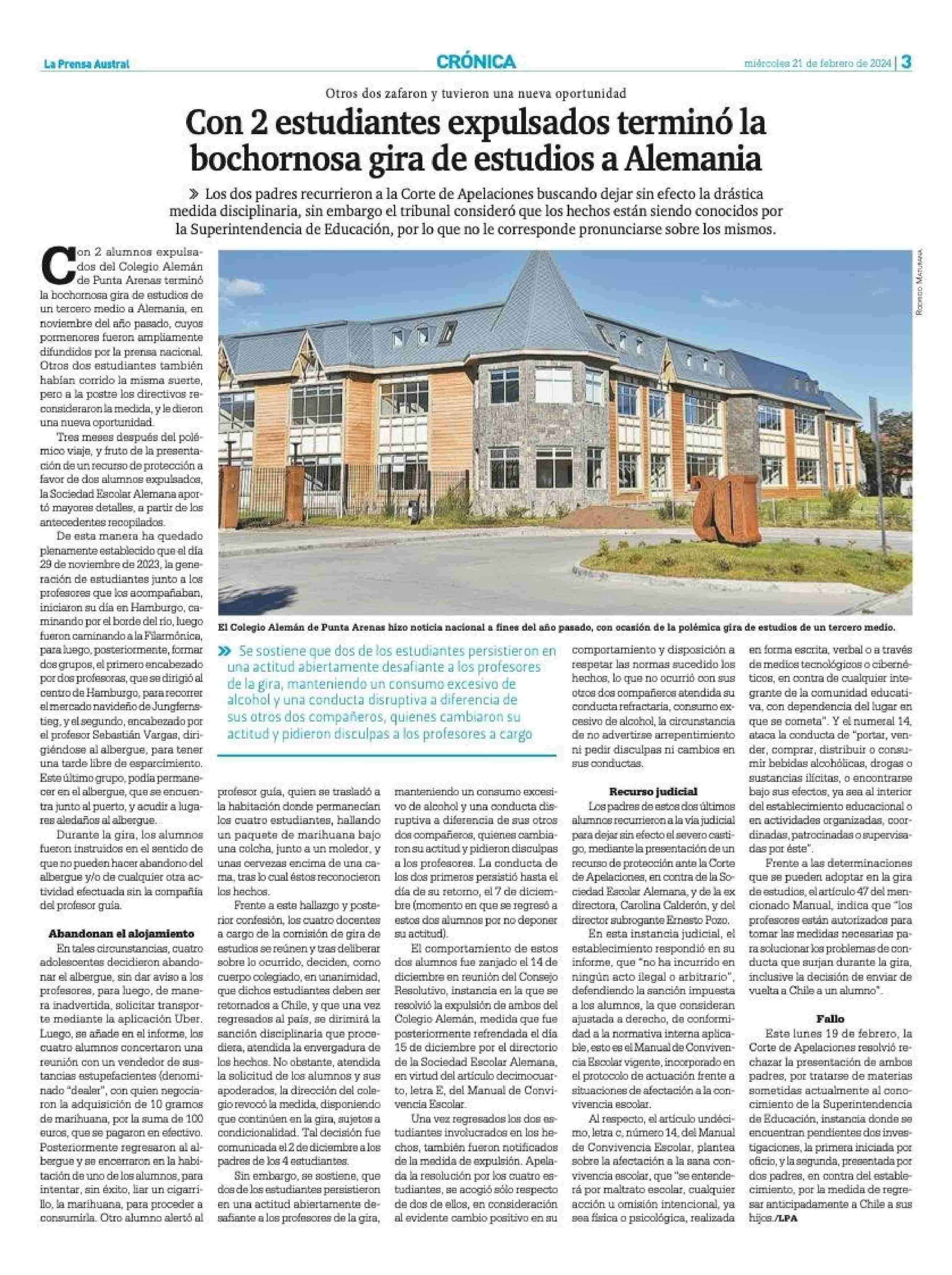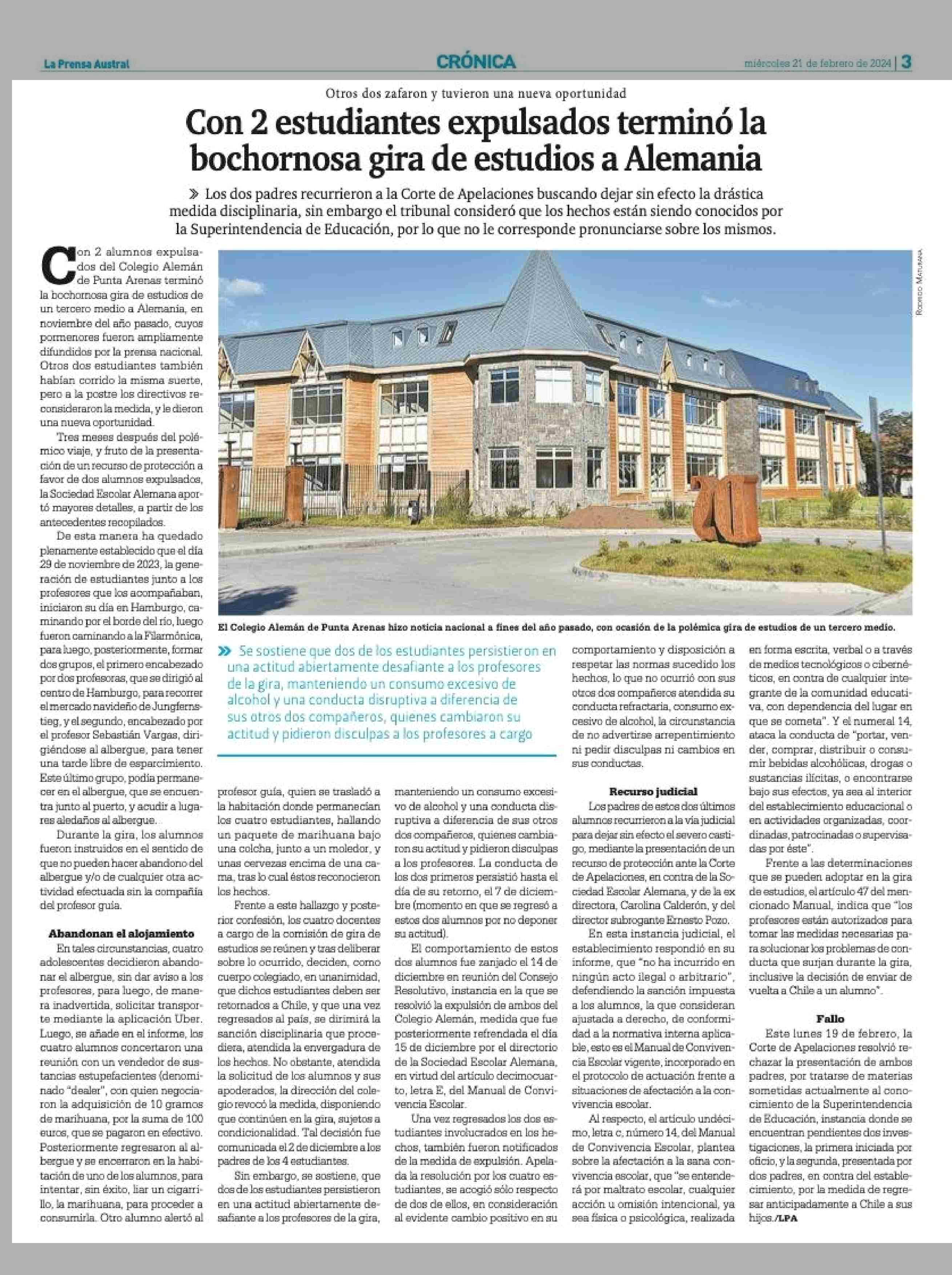 Con 2 estudiantes expulsados terminó la bochornosa gira de estudios a Alemania 21-02-2024 La Prensa Austral |