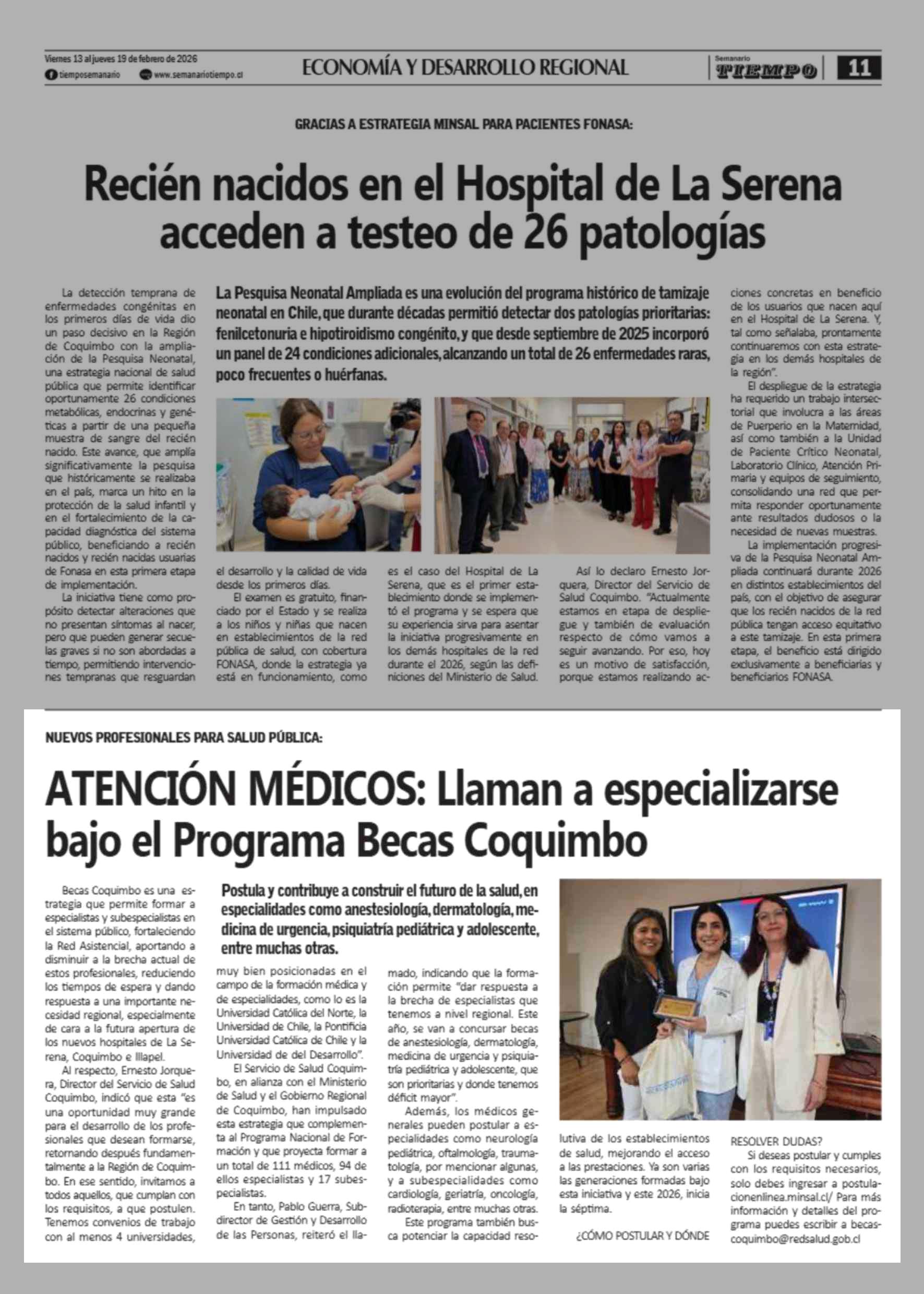 ATENCIÓN MÉDICOS: Llaman a especializarse bajo el Programa Becas Coquimbo 13-02-2026 Semanario Tiempo |