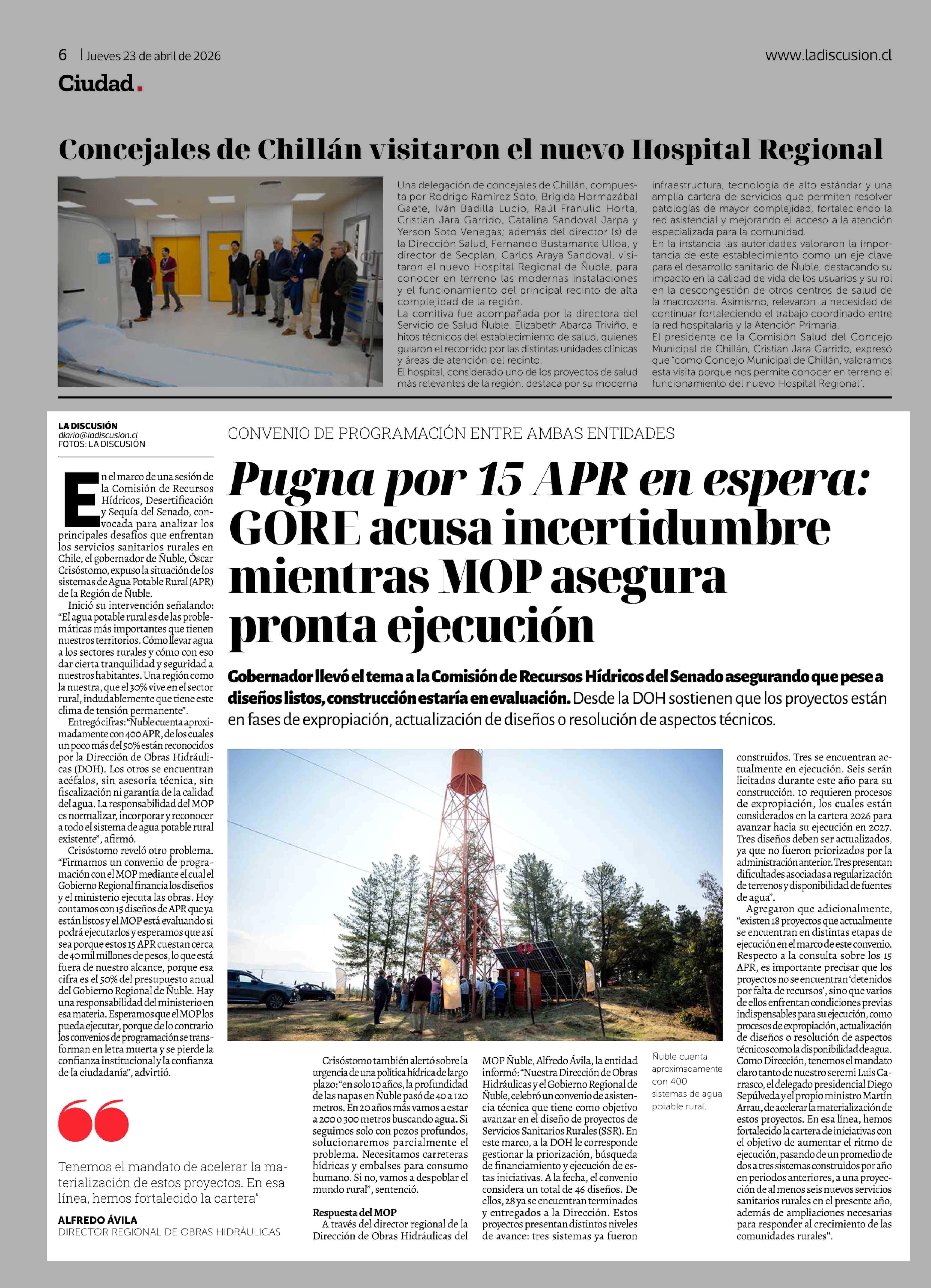 Pugna por 15 APR en espera: GORE acusa incertidumbre mientras MOP asegura pronta ejecución 23-04-2026 La Discusión |