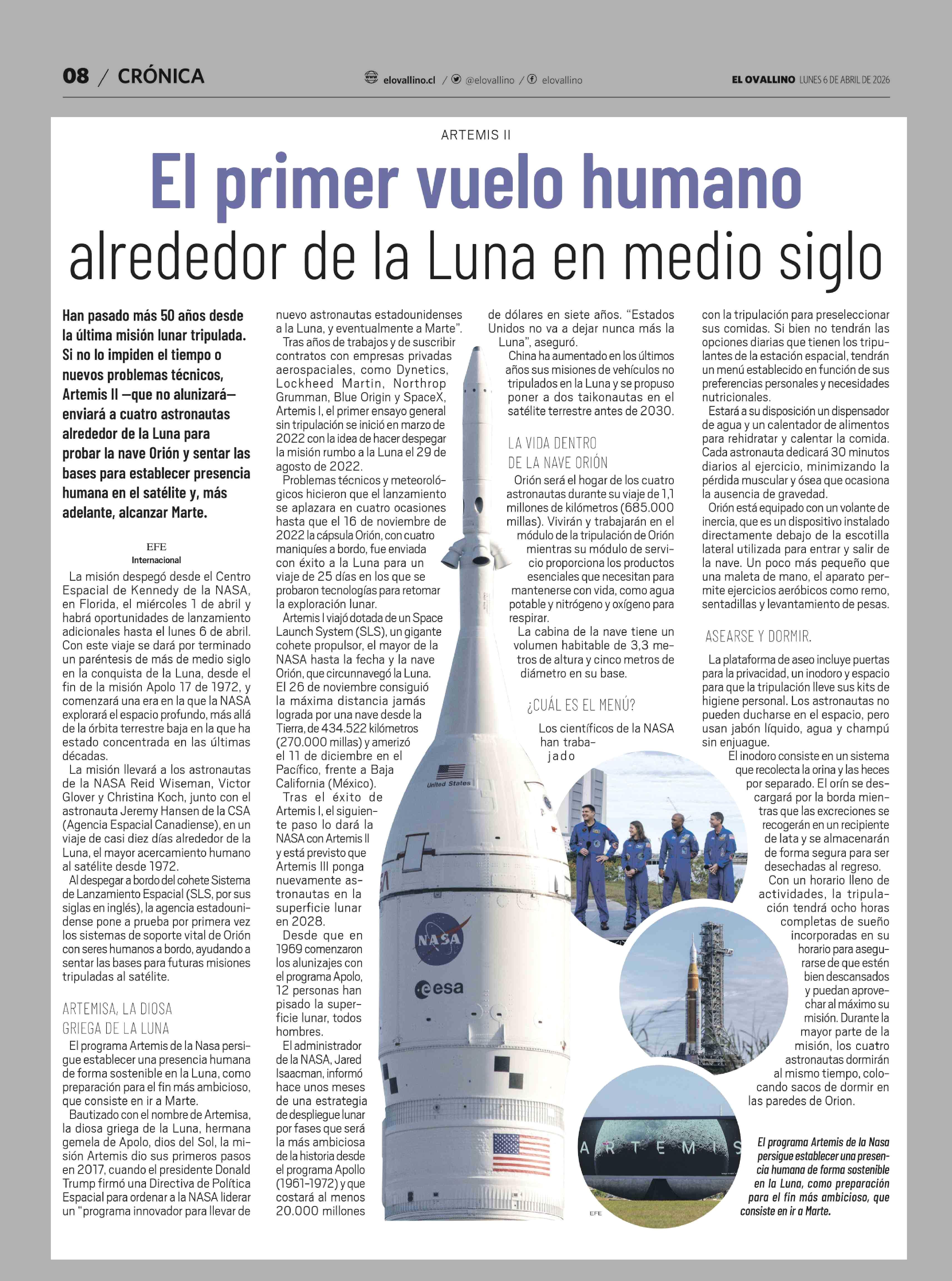 El primer vuelo humano alrededor de la Luna en medio siglo 06-04-2026 El Ovallino |