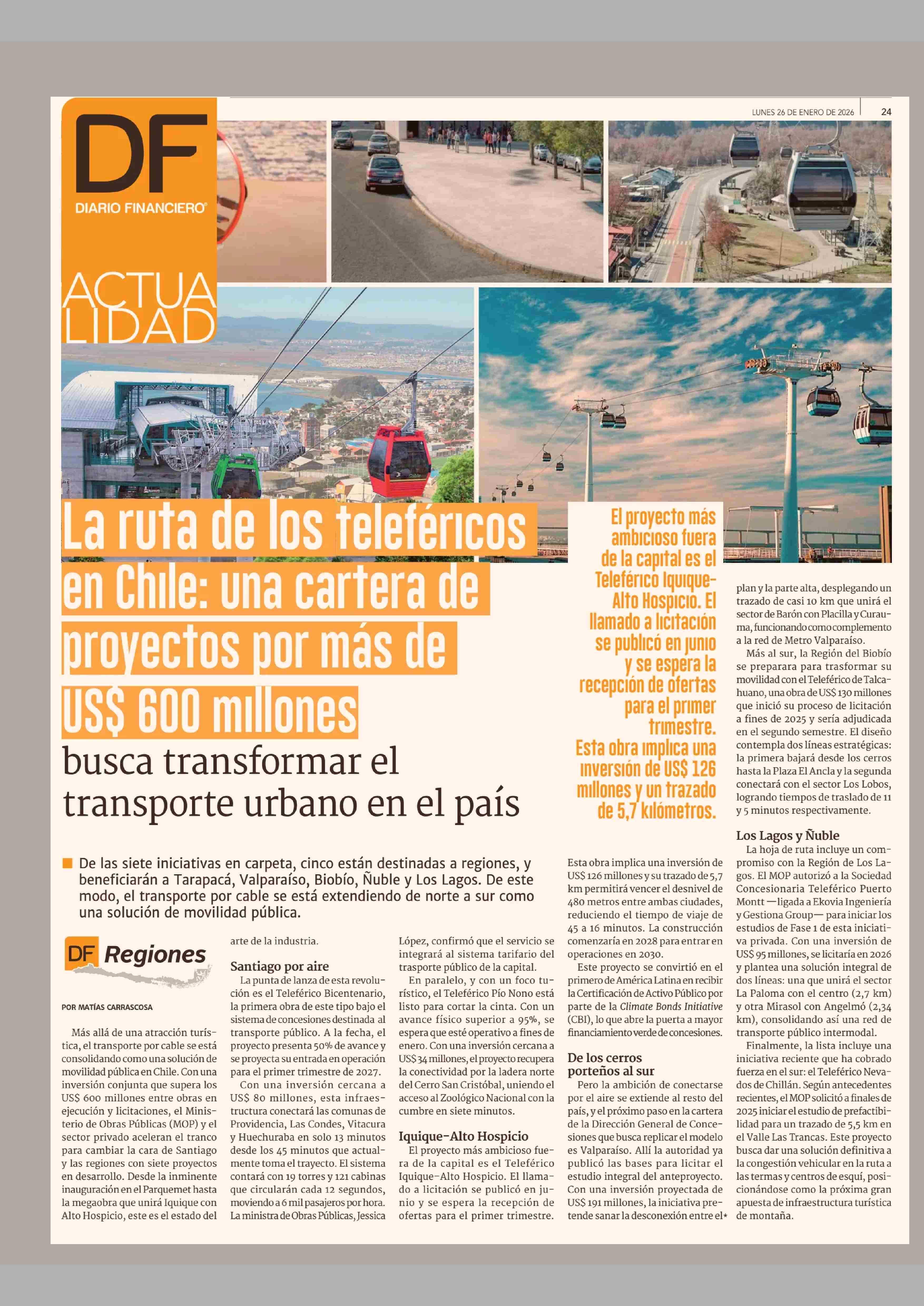 La ruta de los teleféricos en Chile: una cartera de proyectos por más de US$ 600 millones busca transformar el transporte urbano en el país 26-01-2026 Diario Financiero |