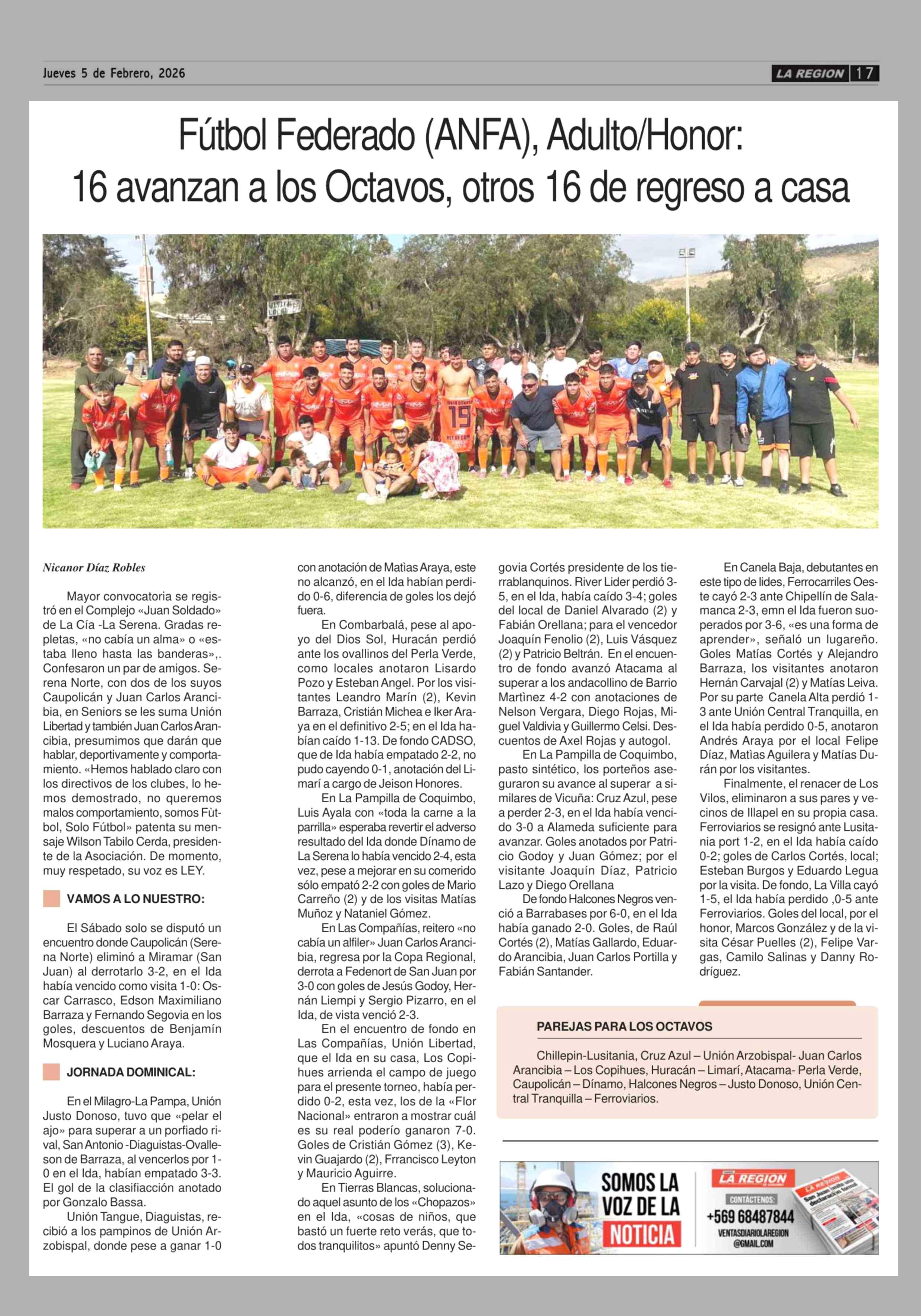 Fútbol Federado (ANFA), Adulto/Honor: 16 avanzan a los Octavos, otros 16 de regreso a casa 05-02-2026 Diario la Región |