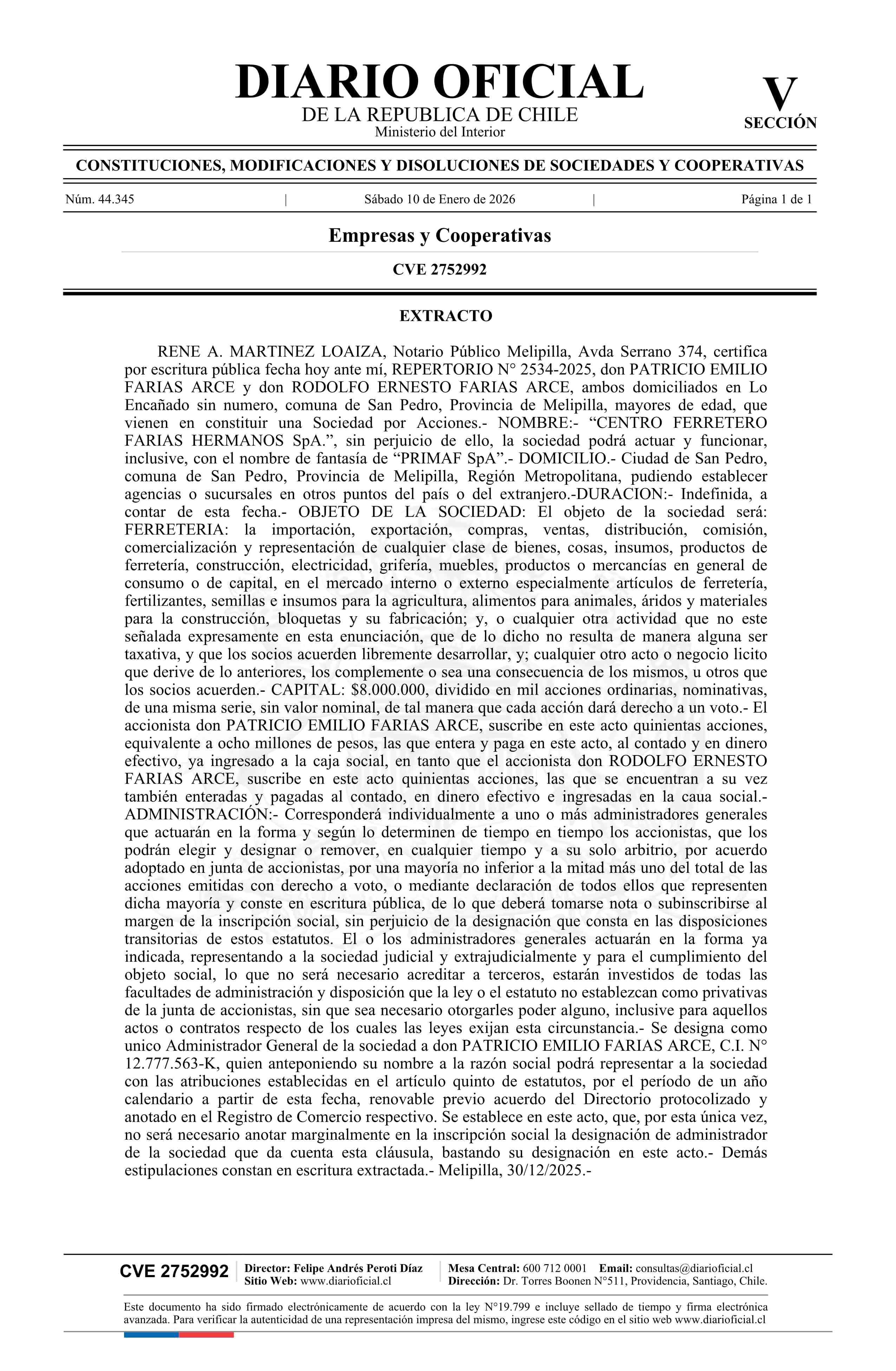CENTRO FERRETERO FARIAS HERMANOS SpA 10-01-2026 Diario Oficial Edición Electrónica |
