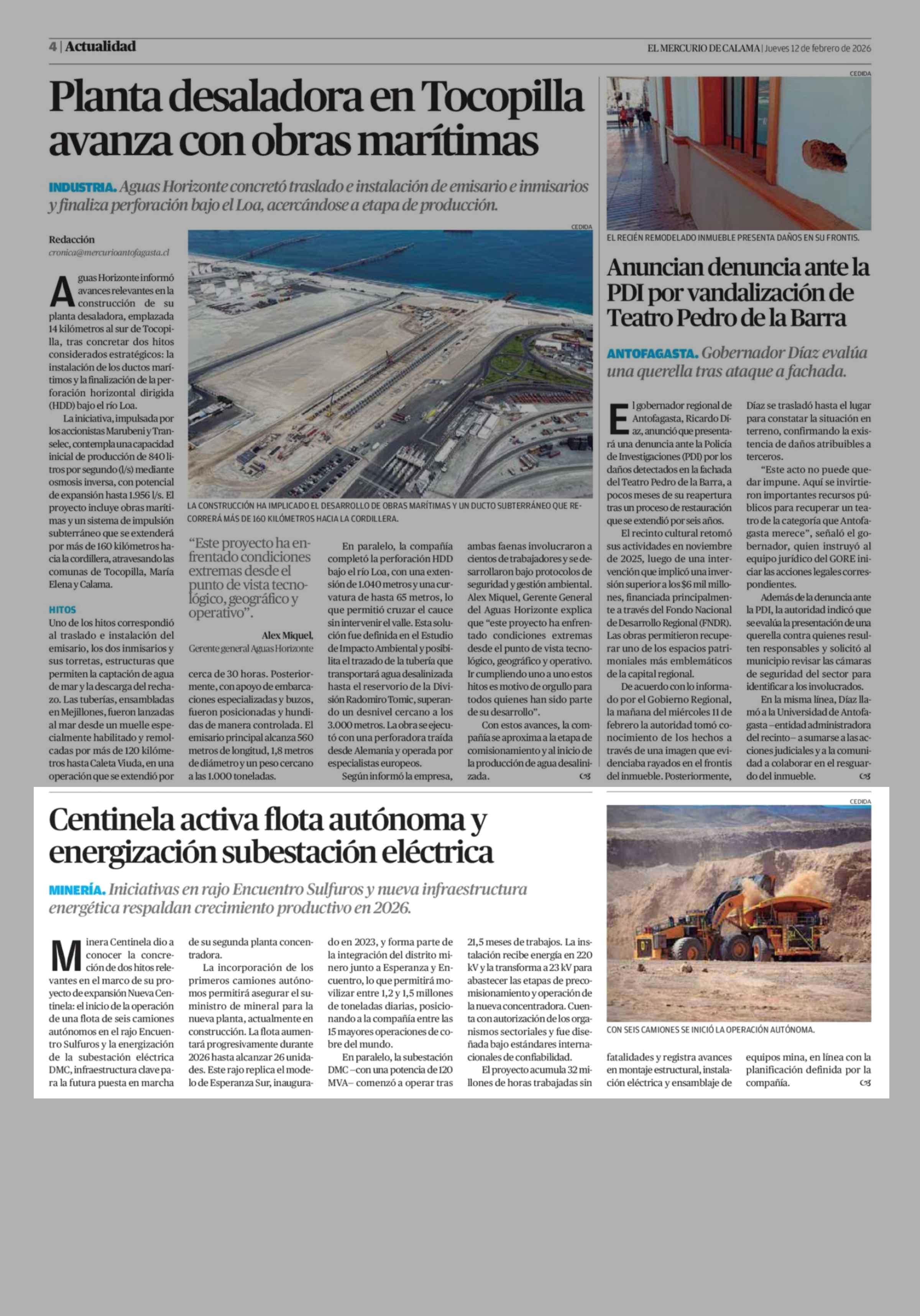 Centinela activa flota autónoma y energización subestación eléctrica 12-02-2026 El Mercurio de Calama |