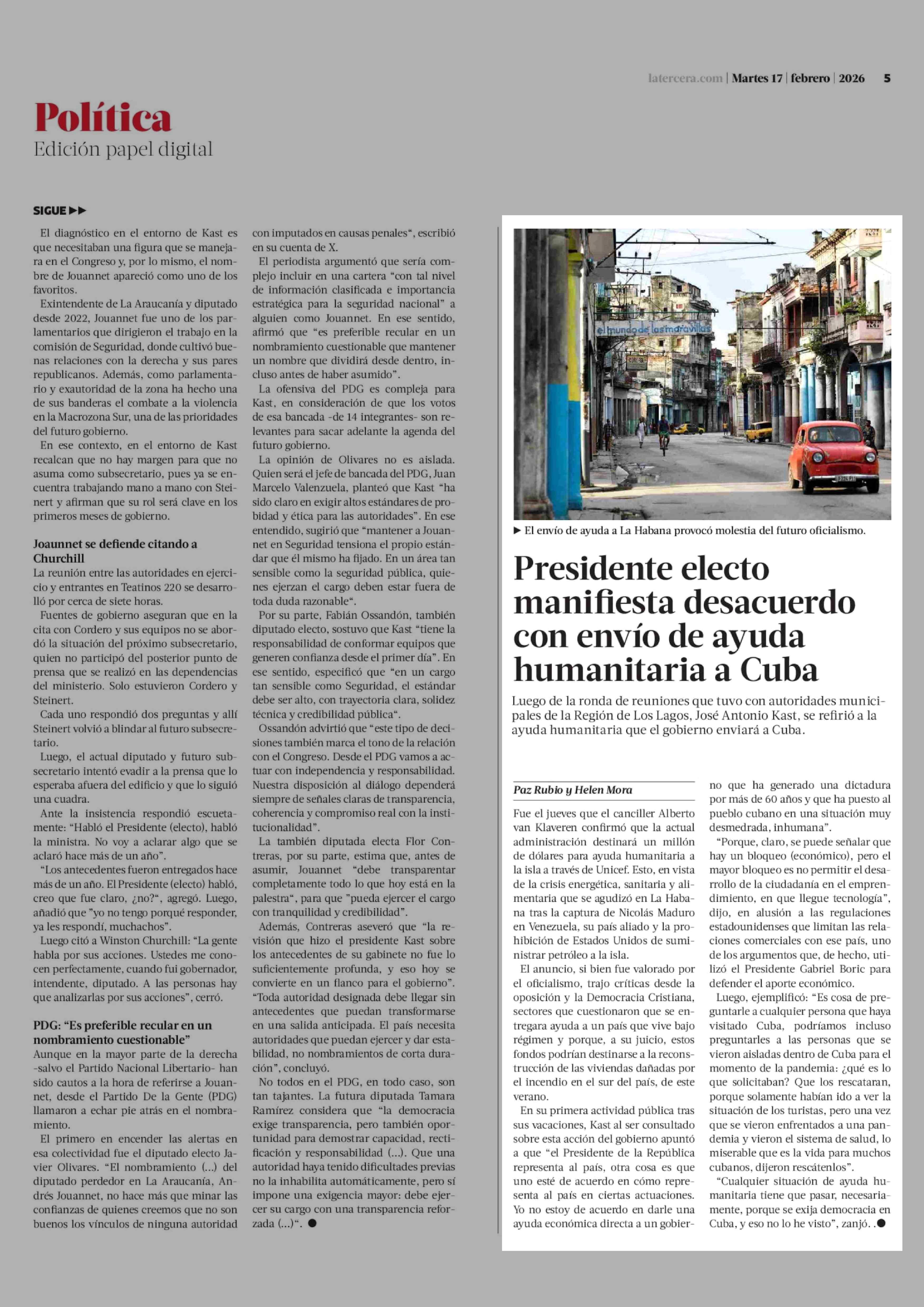 Presidente electo manifiesta desacuerdo con envío de ayuda humanitaria a Cuba 17-02-2026 La Tercera |