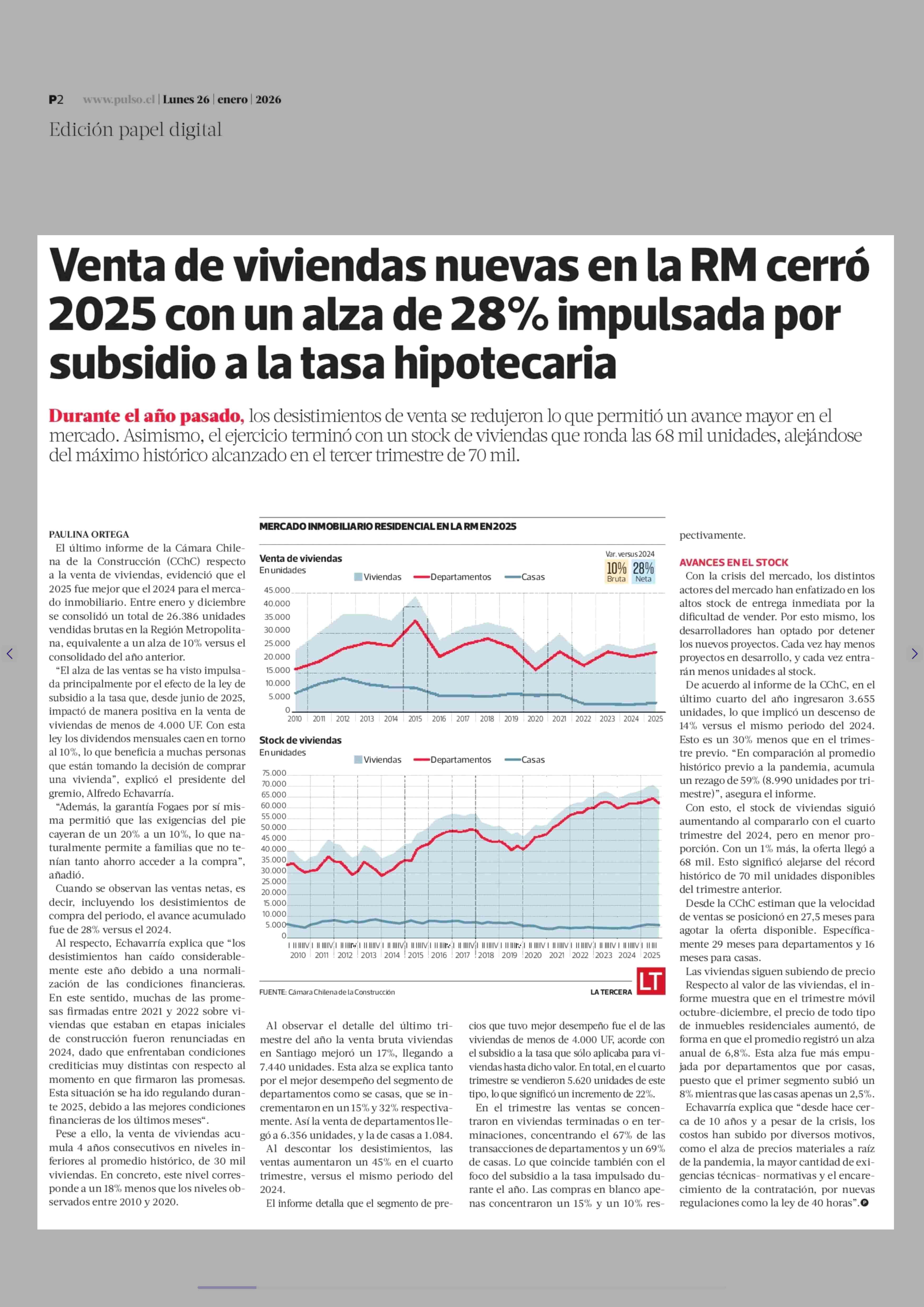Venta de viviendas nuevas en la RM cerró 2025 con un alza de 28% impulsada por subsidio a la tasa hipotecaria 26-01-2026 La Tercera |