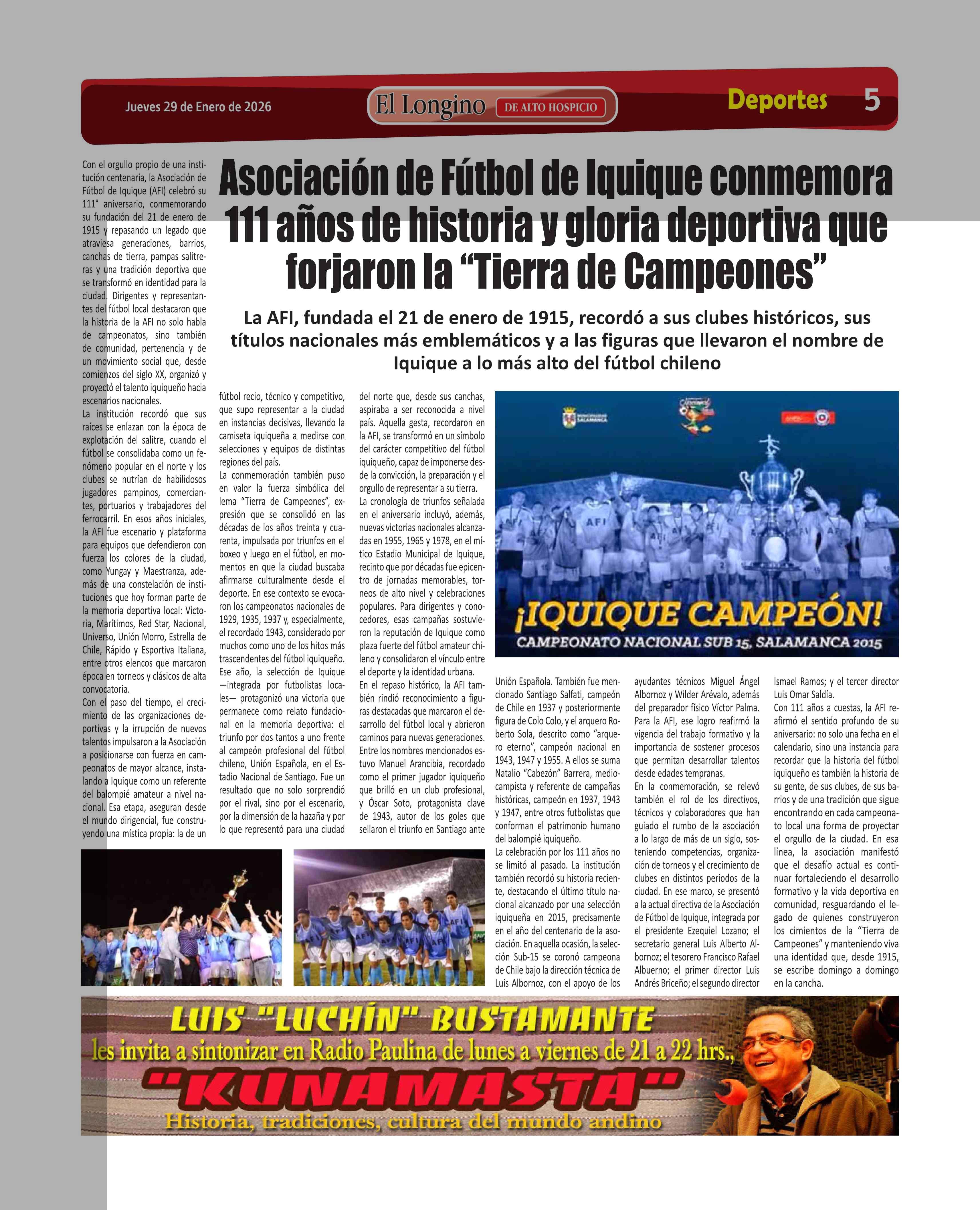 | Título: | Asociación de Fútbol de Iquique conmemora 111 años de historia y gloria deportiva que forjaron la "Tierra de Campeones" |