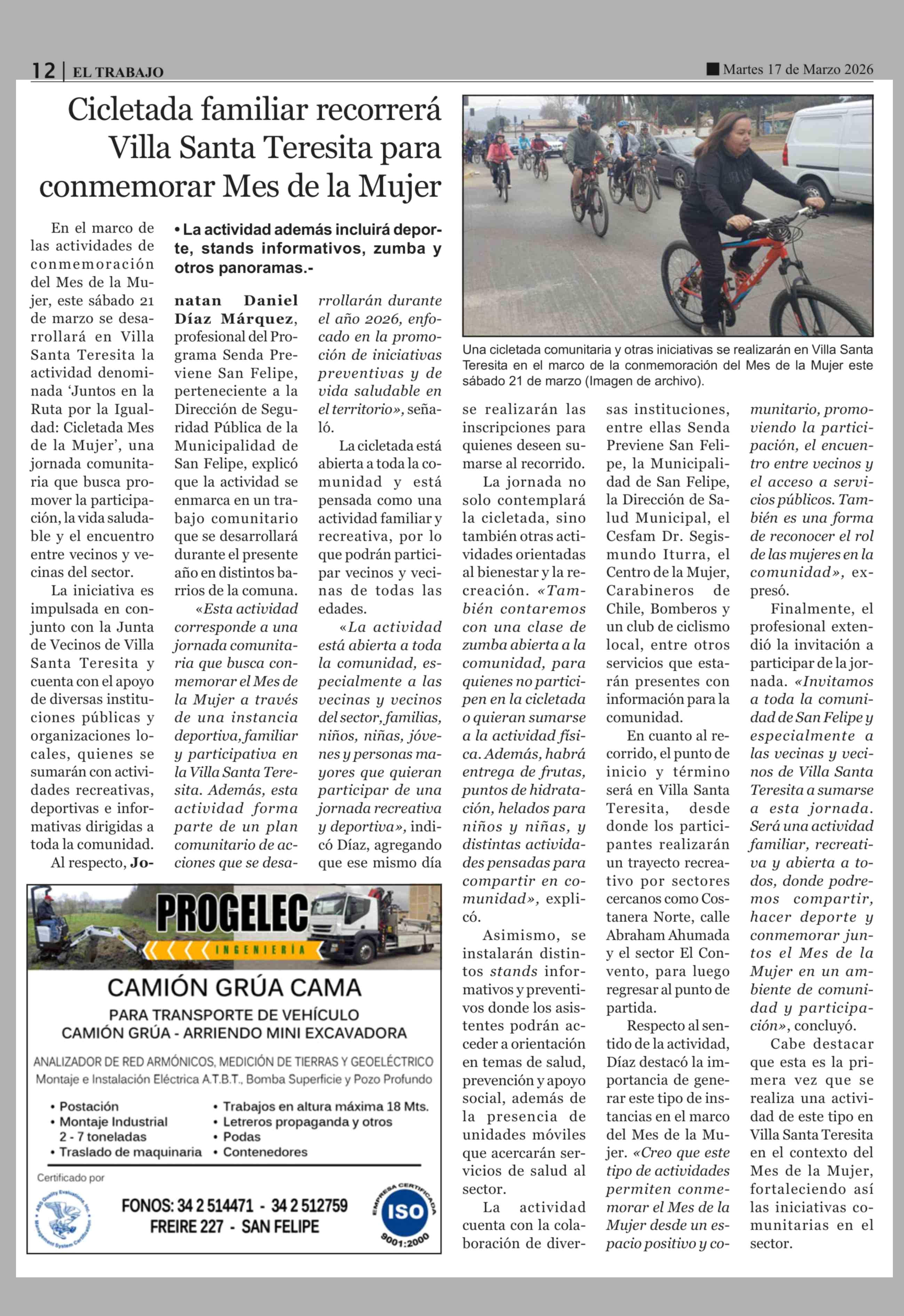 Cicletada familiar recorrerá Villa Santa Teresita para conmemorar Mes de la Mujer 17-03-2026 El Trabajo |