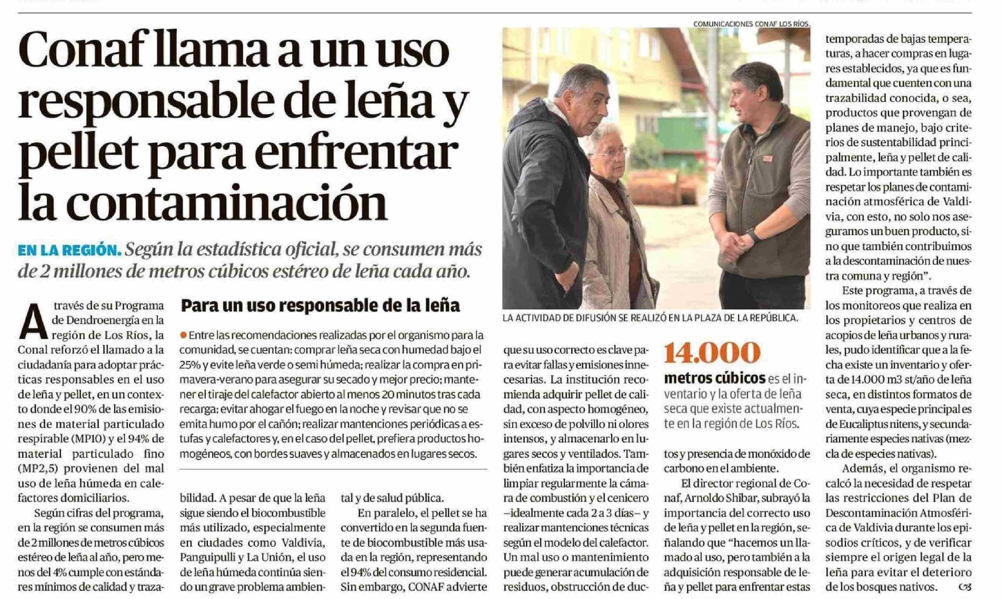 Conaf llama a un uso responsable de leña y pellet para enfrentar la contaminación 25-05-2025 Diario Austral Región de Los Ríos |