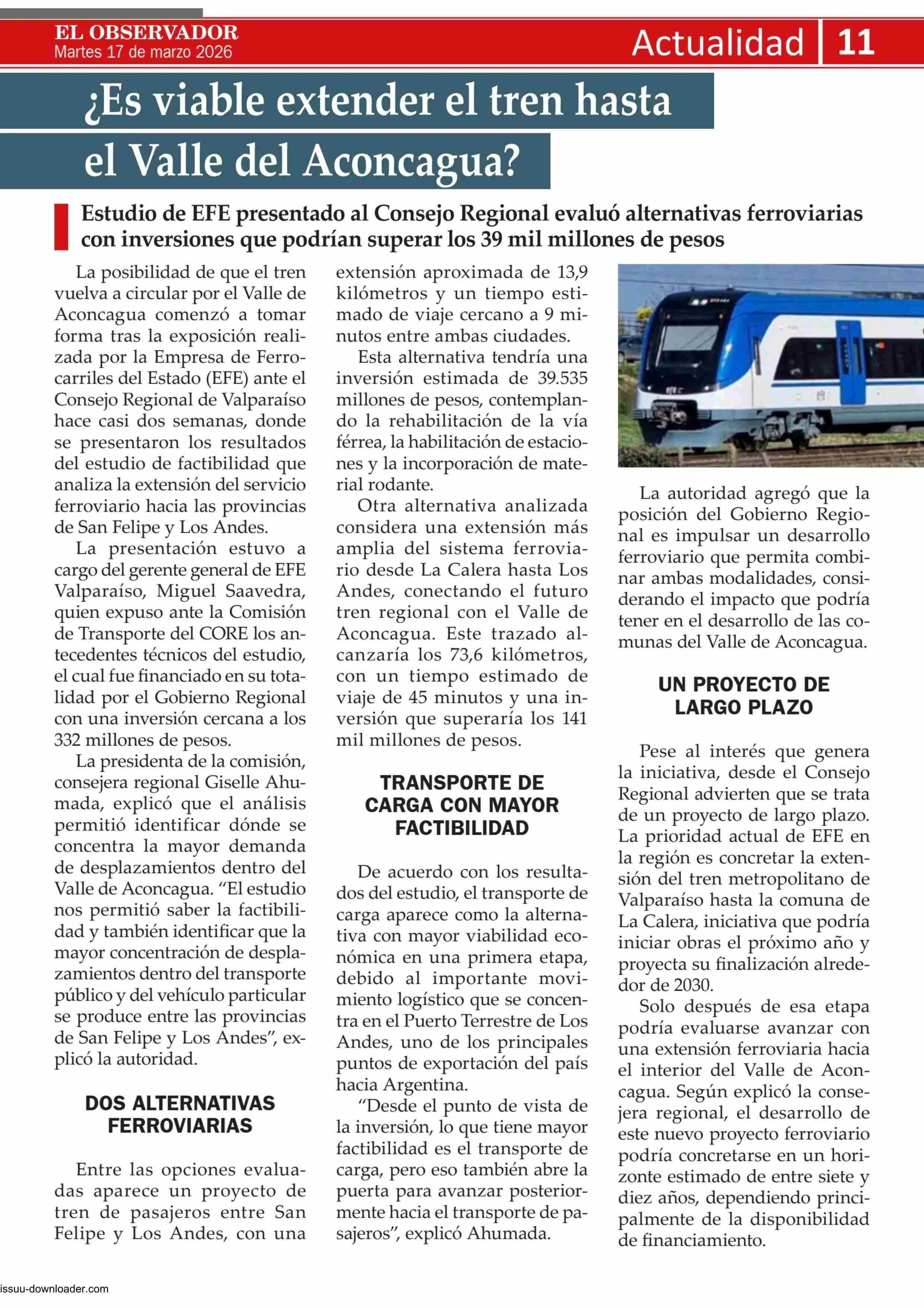 ¿es viable extender el tren hasta el valle del Aconcagua? 17-03-2026 El Observador Vespertino |