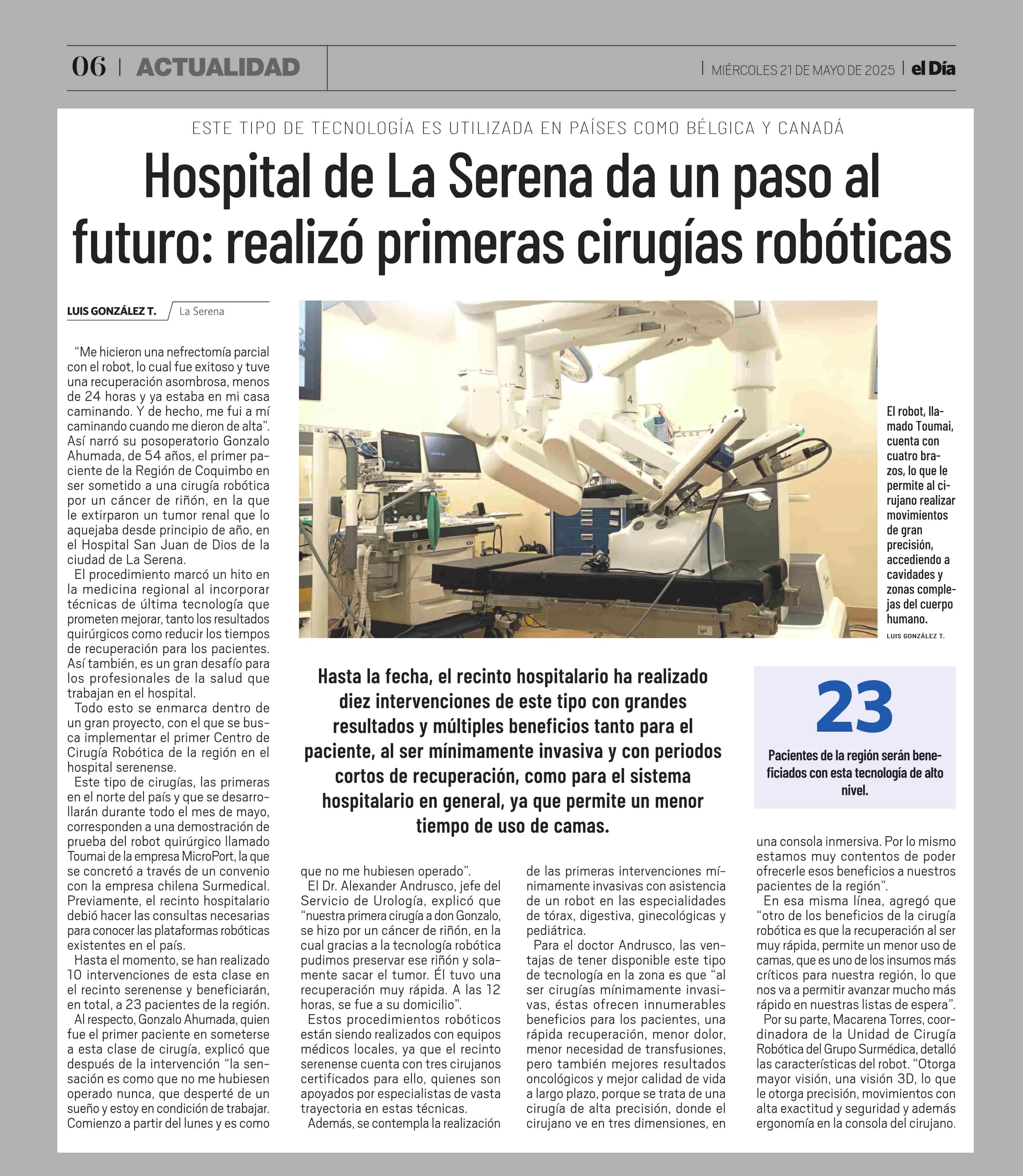 Hospital de La Serena da un paso al futuro: realizó primeras cirugías robóticas 21-05-2025 El Día |