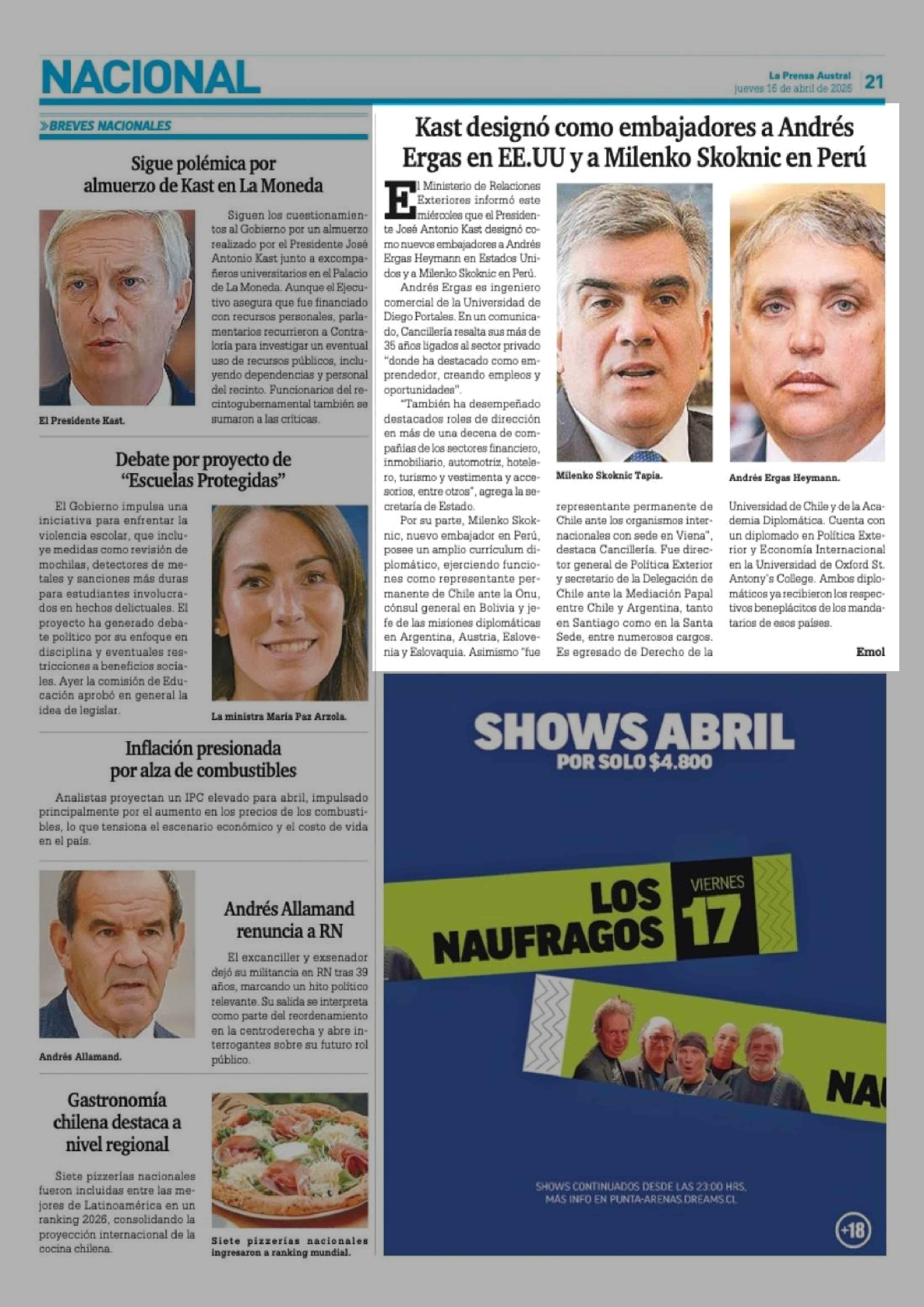 Kast designó como embajadores a Andrés Ergas en EE.UU y a Milenko Skoknic en Perú 16-04-2026 La Prensa Austral |