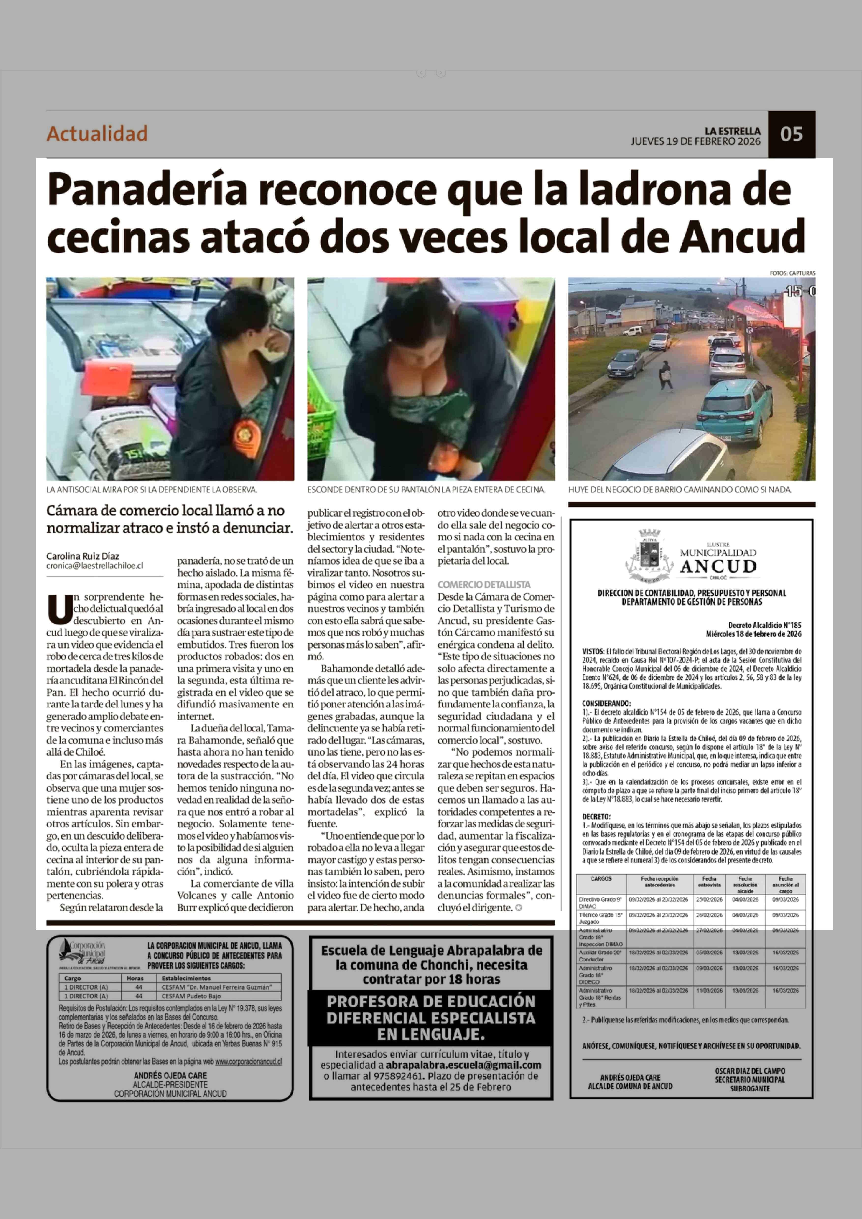 Panadería reconoce que la ladrona de cecinas atacó dos veces local de Ancud 19-02-2026 La Estrella de Chiloé |