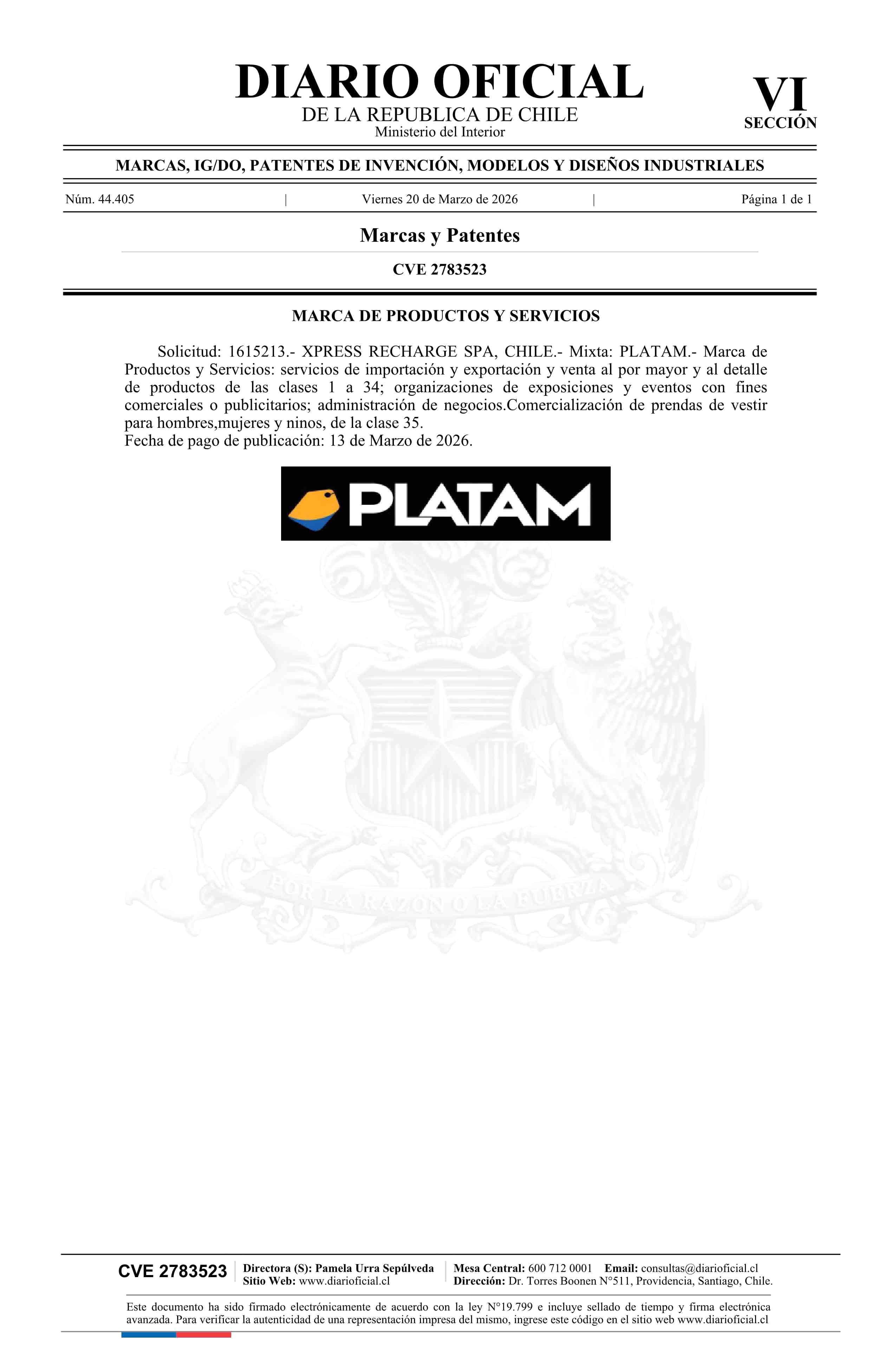 Fuente: Diario Oficial Edición Electrónica (Diario Oficial de Chile - 6 Marcas Y Patentes) Página(s): 1