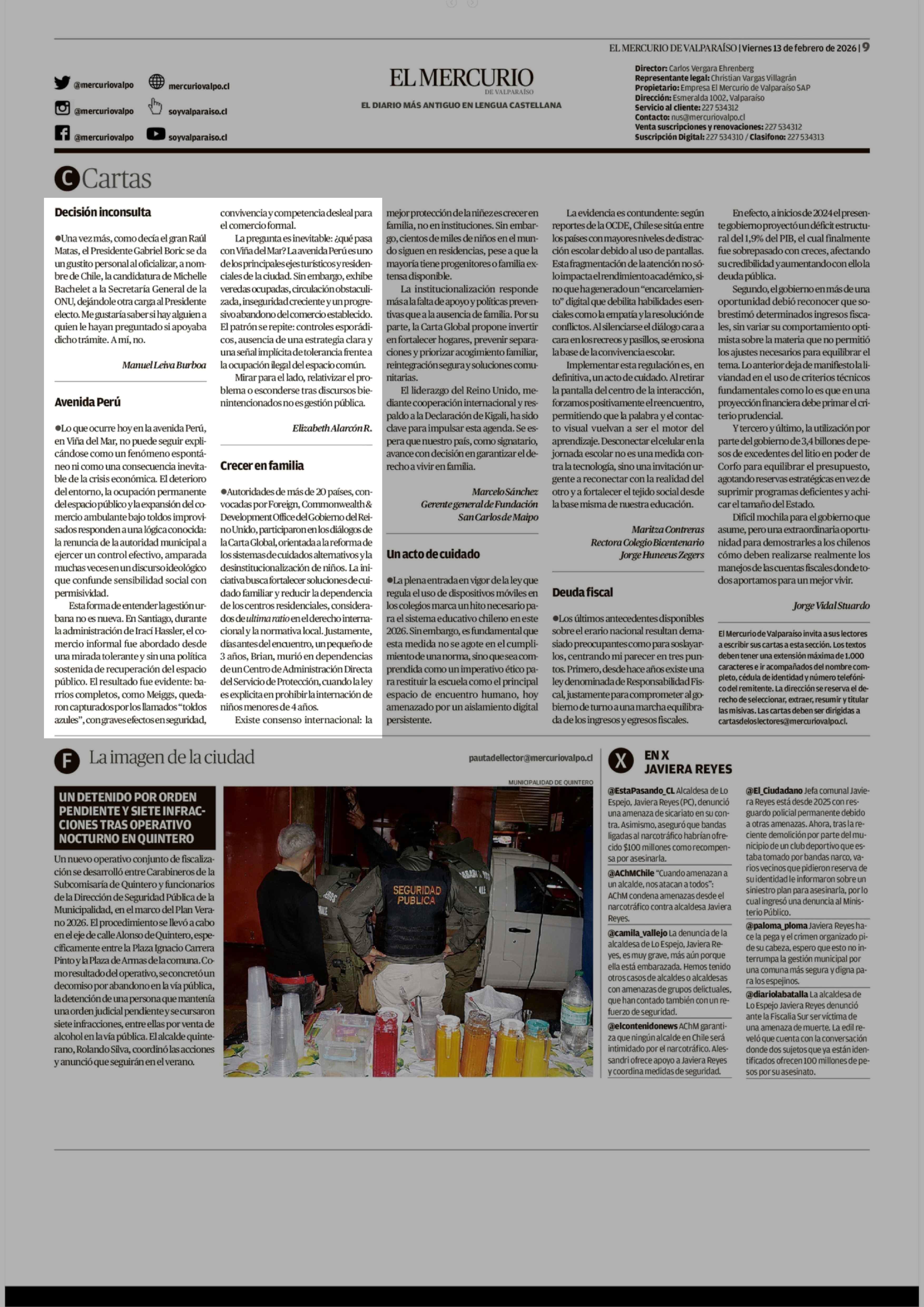 Cartas: Avenida Perú 13-02-2026 El Mercurio de Valparaíso |
