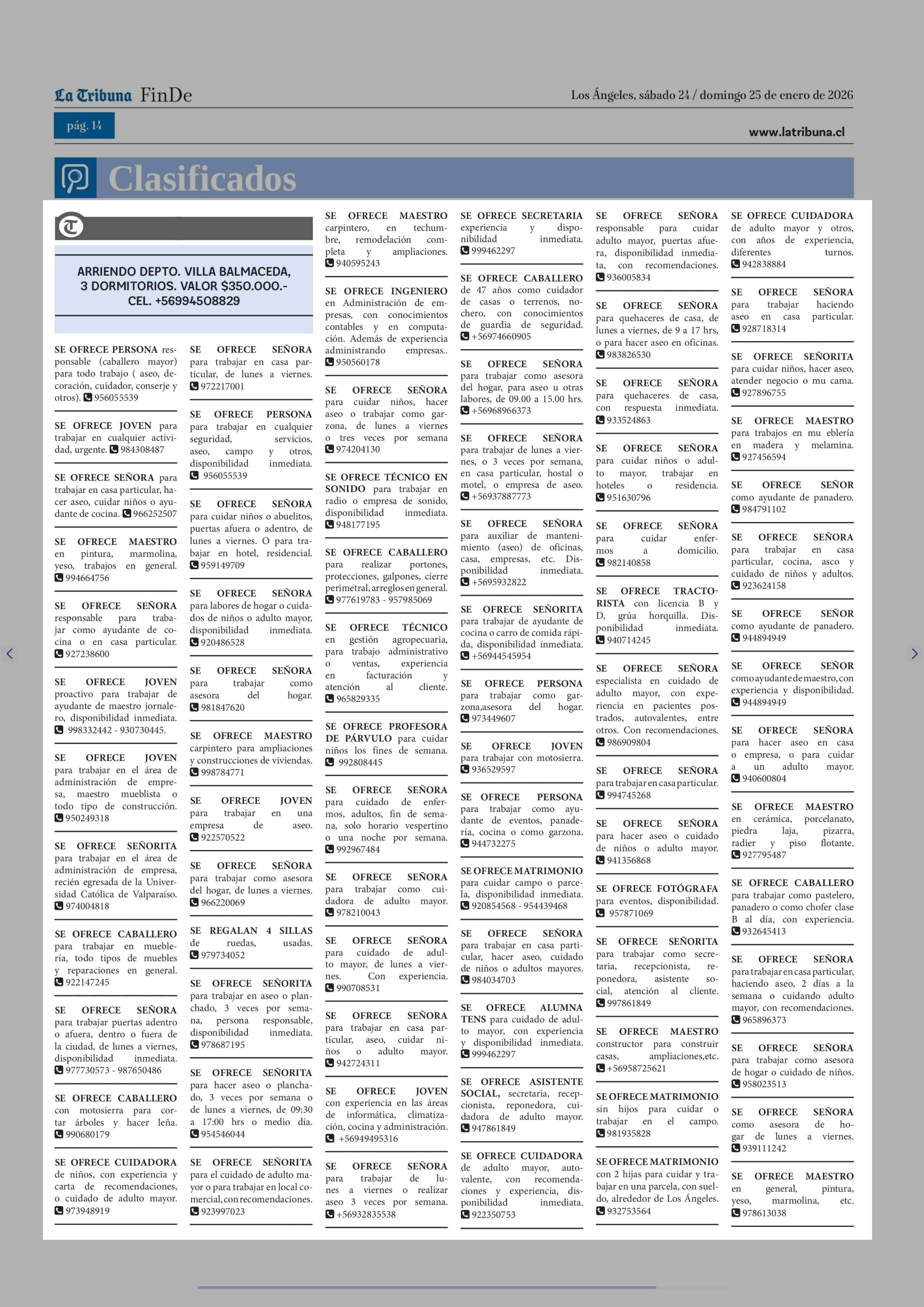 SE OFRECE PERSONA responsable (caballero mayor) para todo trabajo ( aseo, decoración, cuidador, conserje y otros). 956055539 24-01-2026 La Tribuna |