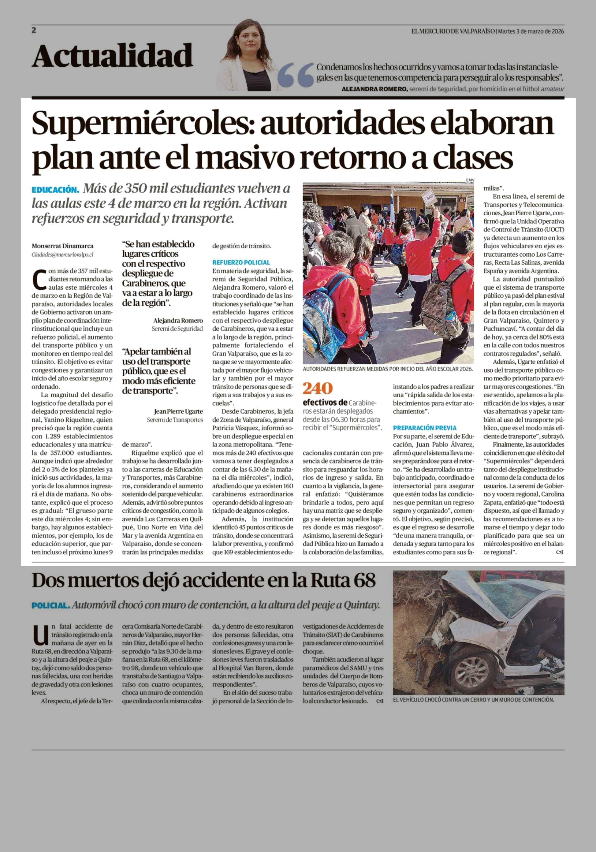Supermiércoles: autoridades elaboran plan ante el masivo retorno a clases 03-03-2026 El Mercurio de Valparaíso |