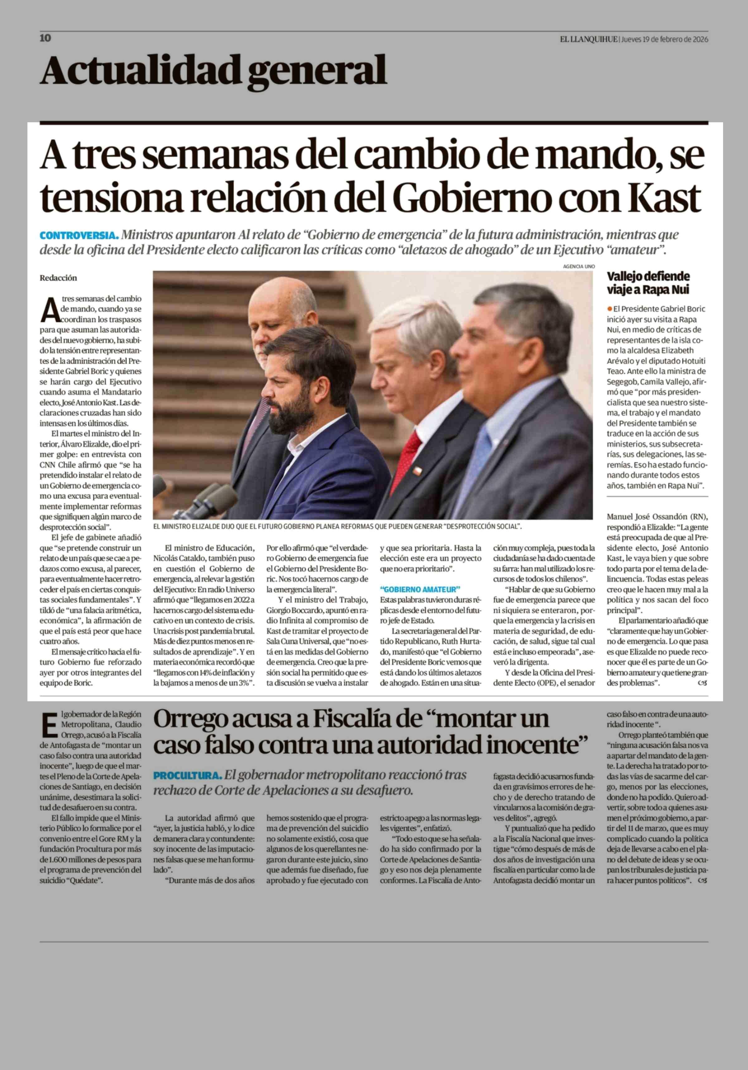 Título: A tres semanas del cambio de mando, se tensiona relación del Gobierno con Kast