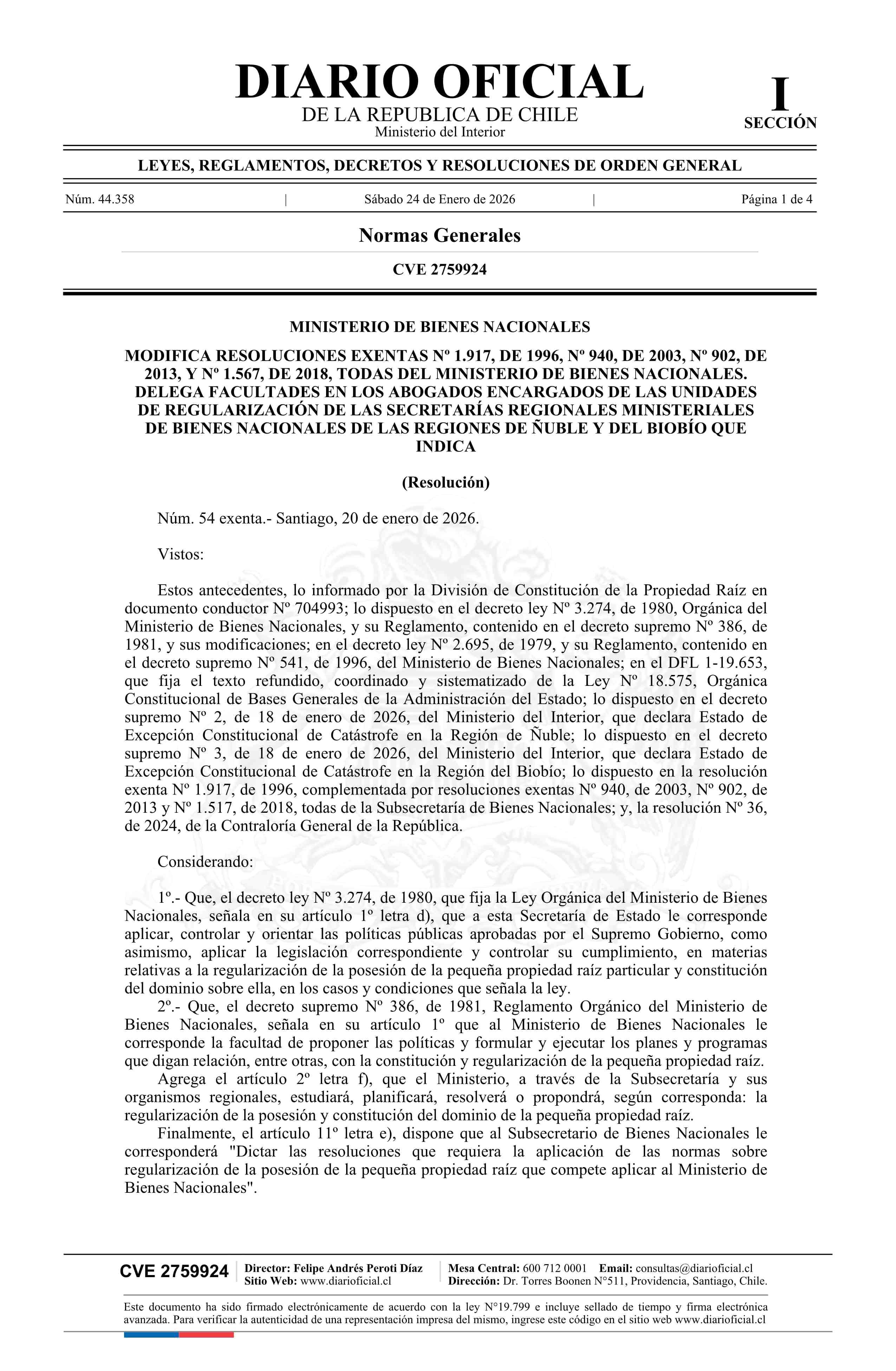 | Título: | Resolución exenta número 54, de 2026.- Modifica resoluciones exentas Nº 1.917, de 1996, Nº 940, de 2003, Nº 902, de 2013, y Nº 1.567, de 2018 y delega facultades en los abogados encargados de las unidades de regularización de las Secretarías Regionales Ministeriales de Bienes Nacionales de las Regio |