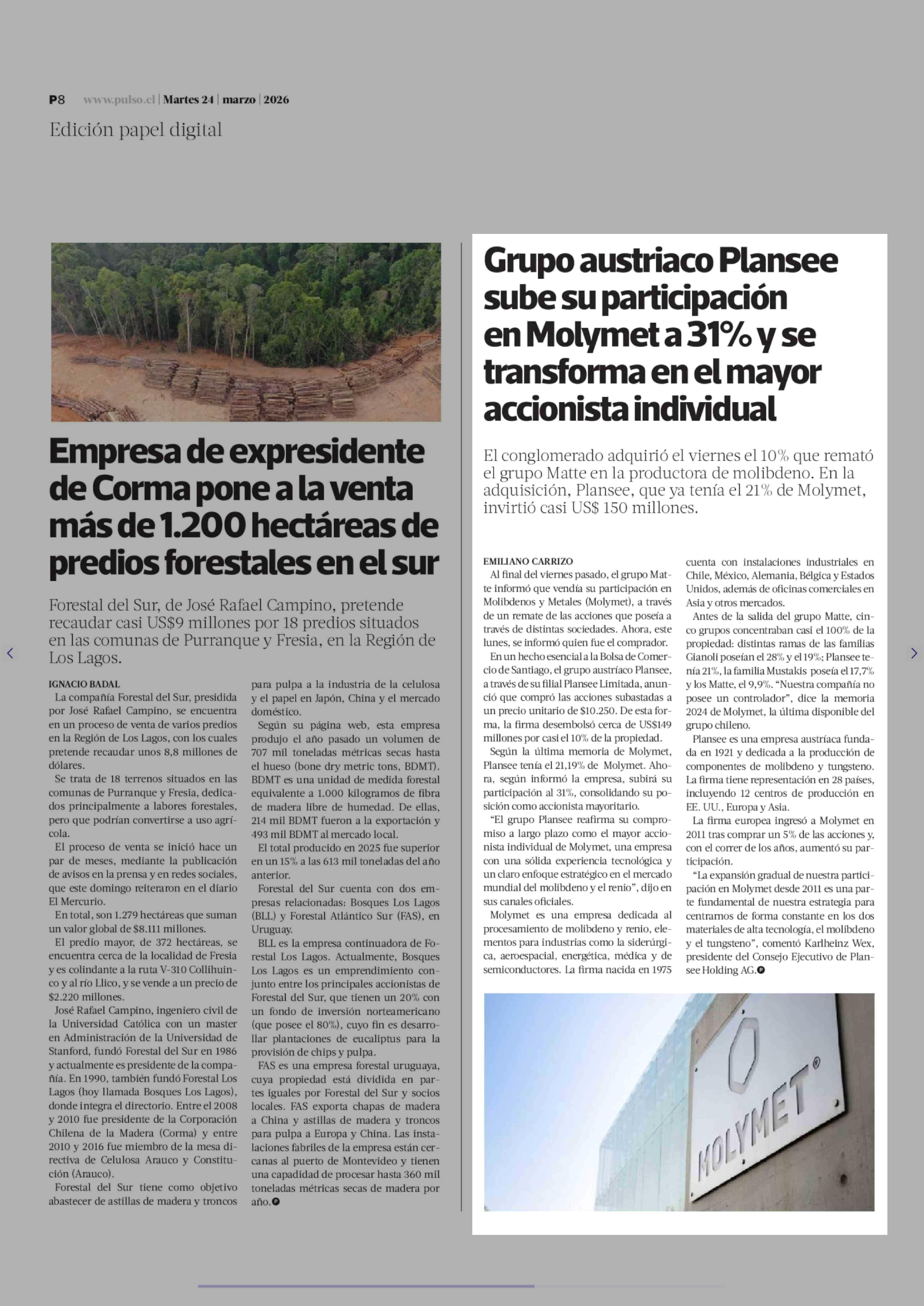 Grupo austriaco Plansee sube su participación en Molymet a 31% y se transforma en el mayor accionista individual 24-03-2026 La Tercera |