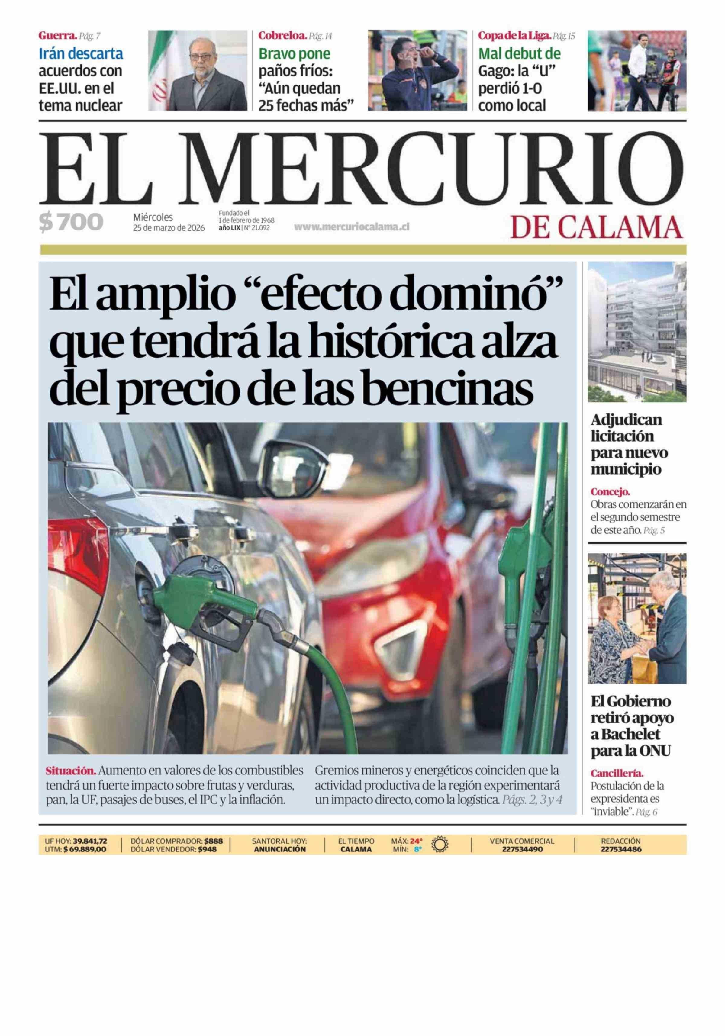 PORTADA EL MERCURIO DE CALAMA CHILE 25-03-2026 El Mercurio de Calama |