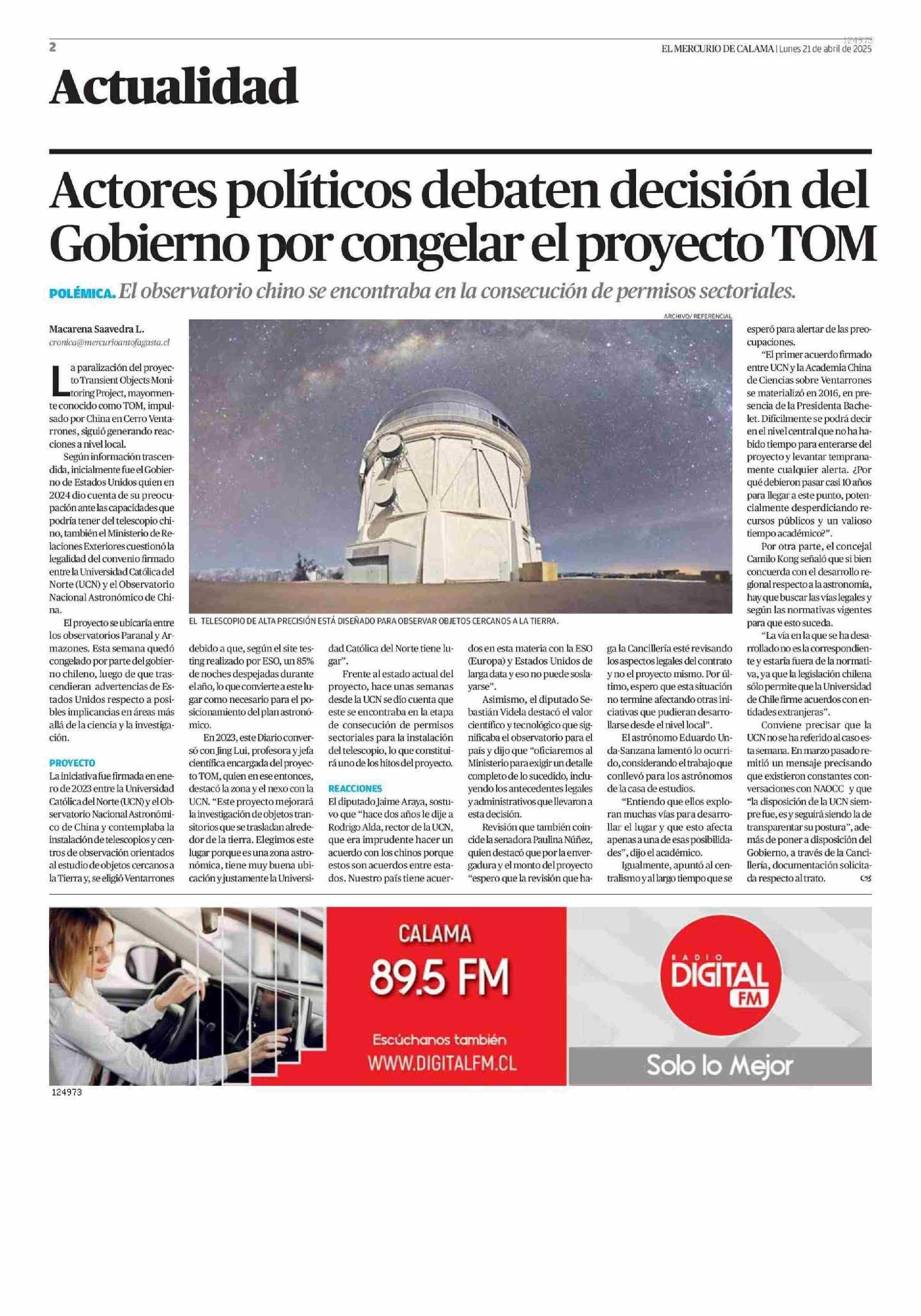 Actores políticos debaten decisión del Gobierno por congelar el proyecto TOM 21-04-2025 El Mercurio de Calama |