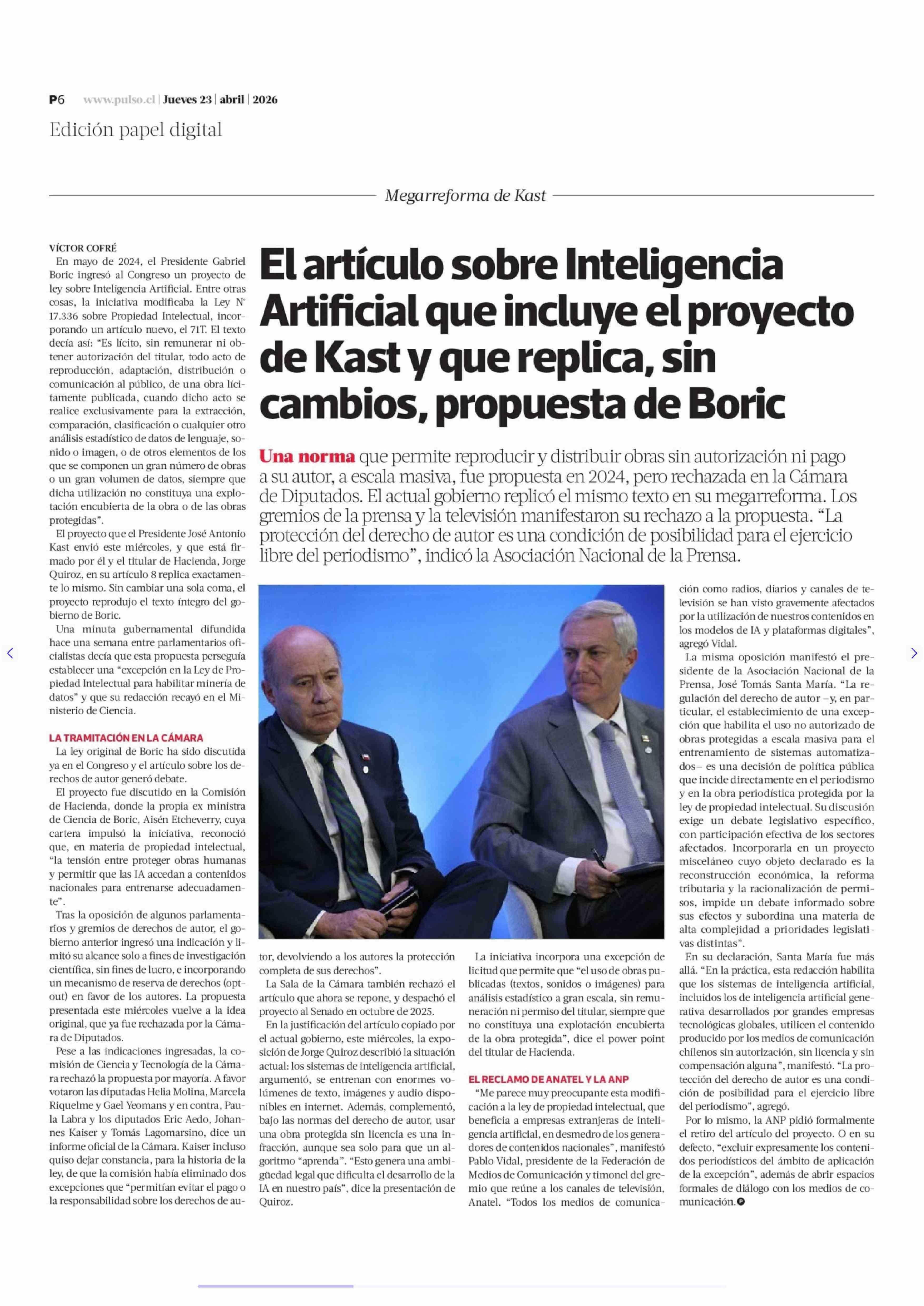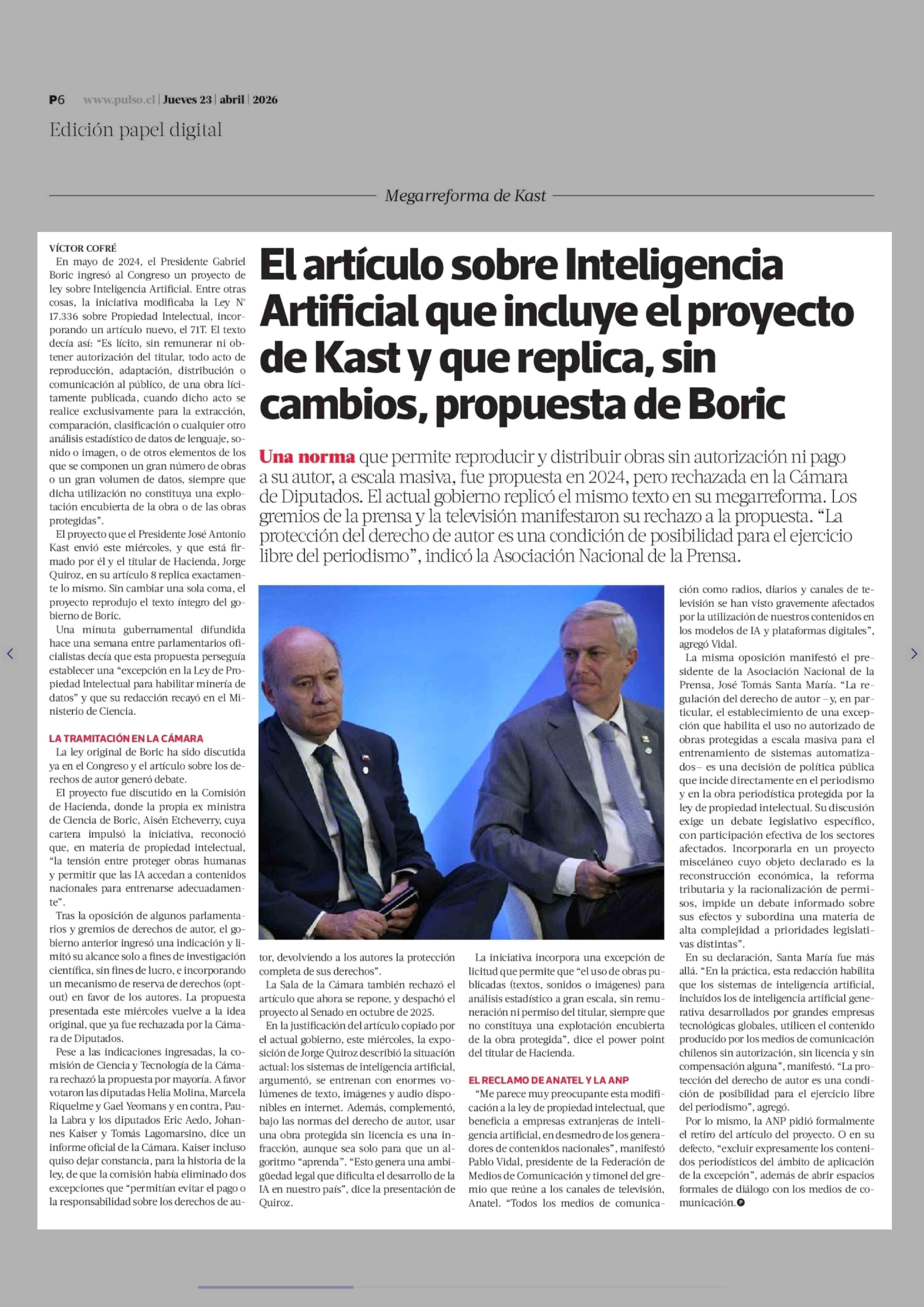 Título: El artículo sobre Inteligencia Artificial que incluye el proyecto de Kast y que replica, sin cambios, propuesta de Boric