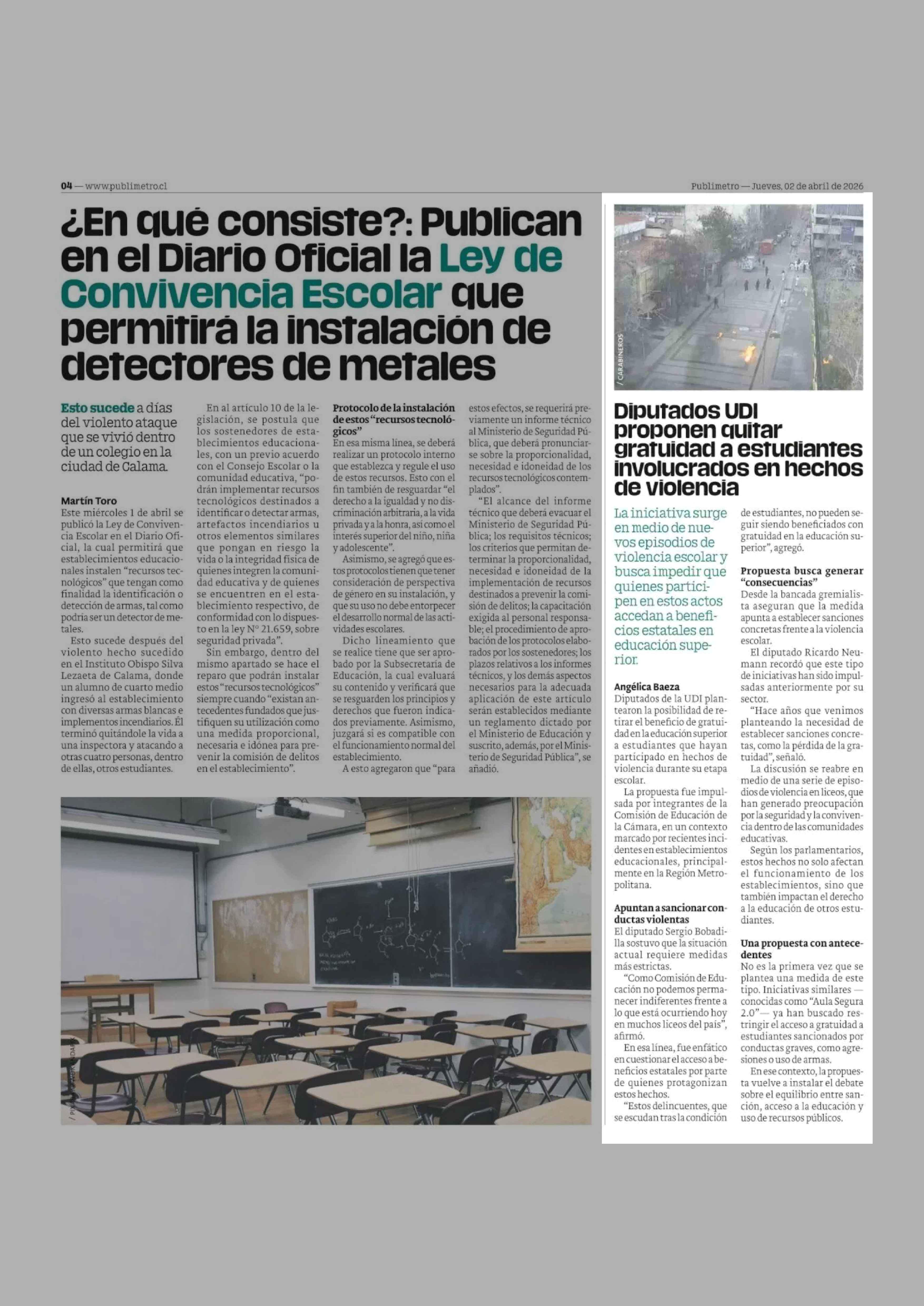 Diputados UDI proponen quitar gratuidad a estudiantes involucrados en hechos de violencia 02-04-2026 Publimetro |
