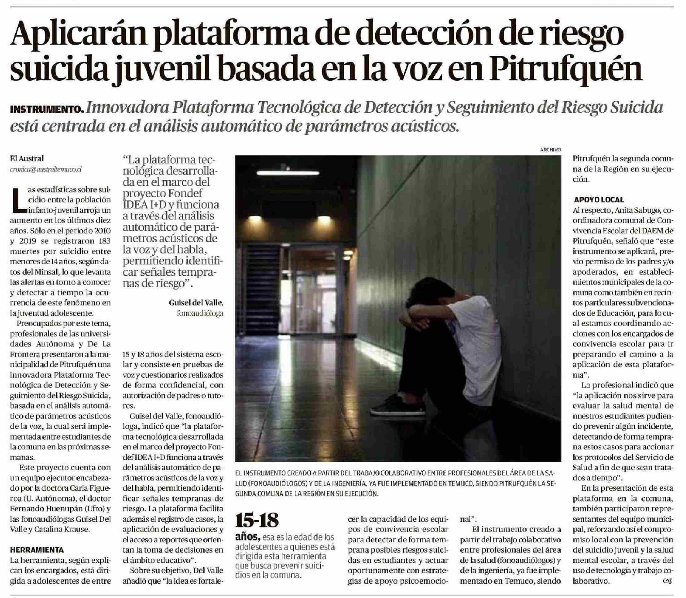 | Título: | Aplicarán plataforma de detección de riesgo suicida juvenil basada en la voz en Pitrufquén |