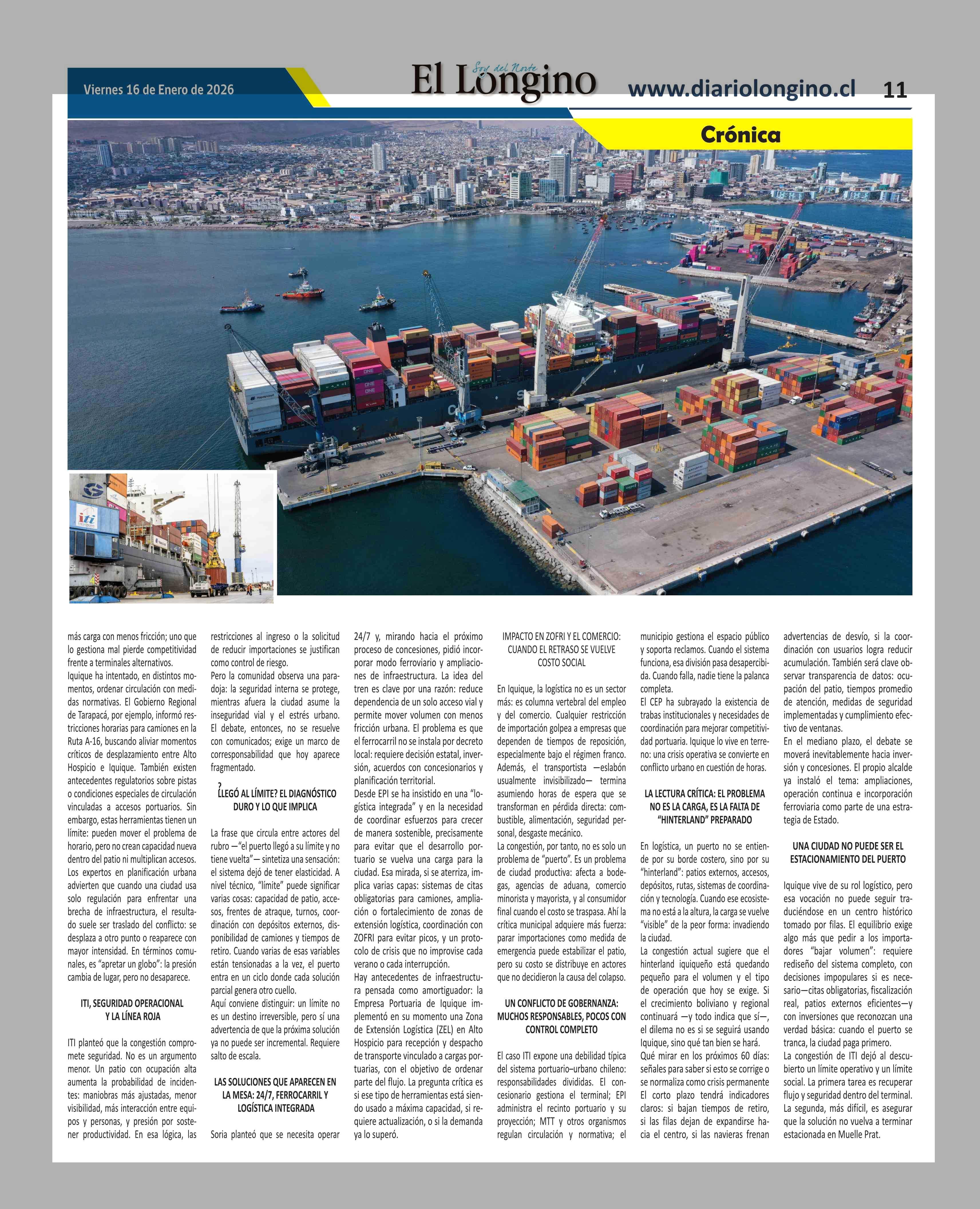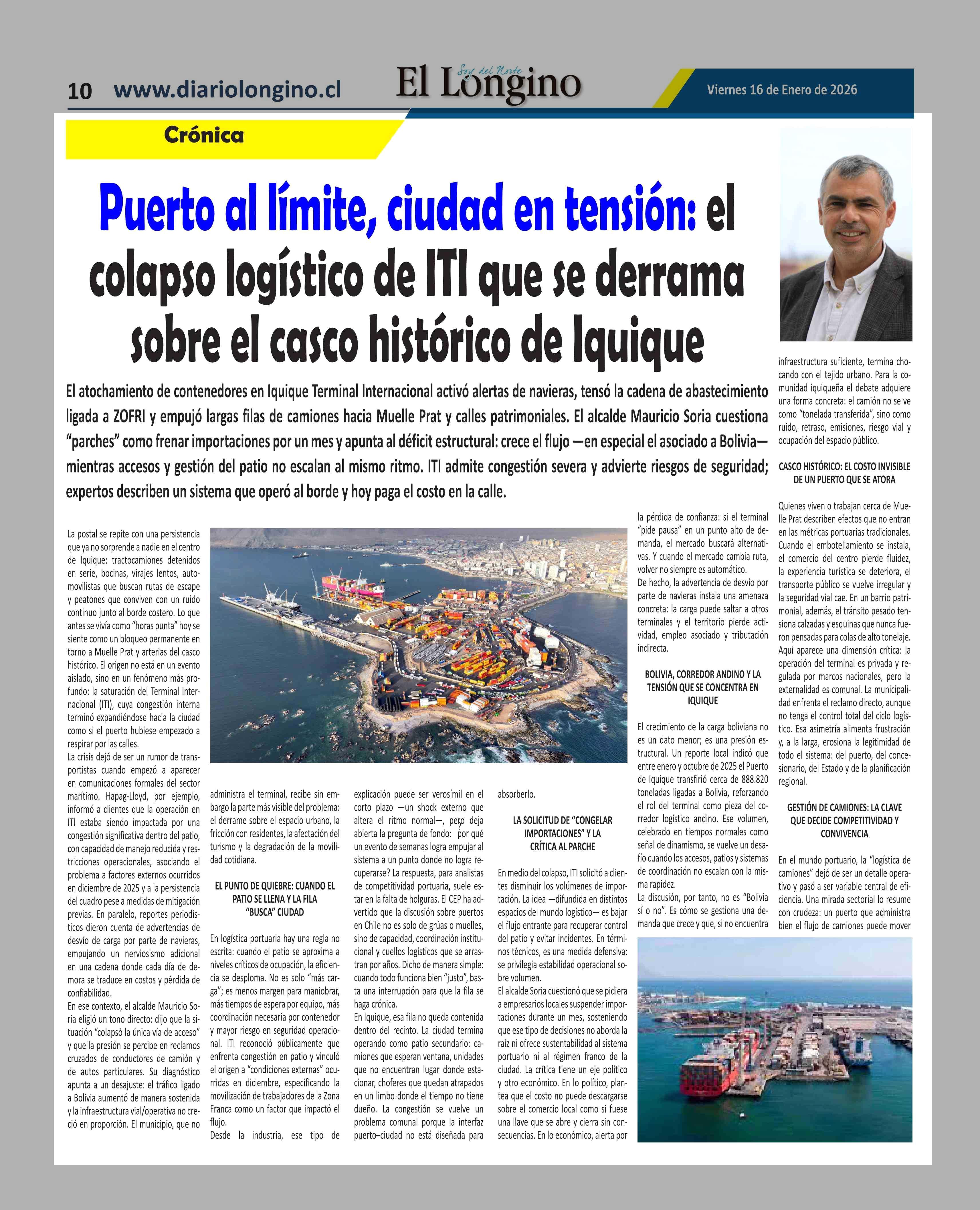 Puerto al límite, ciudad en tensión: el colapso logístico de ITI que se derrama sobre el casco histórico de Iquique 16-01-2026 El Longino |
