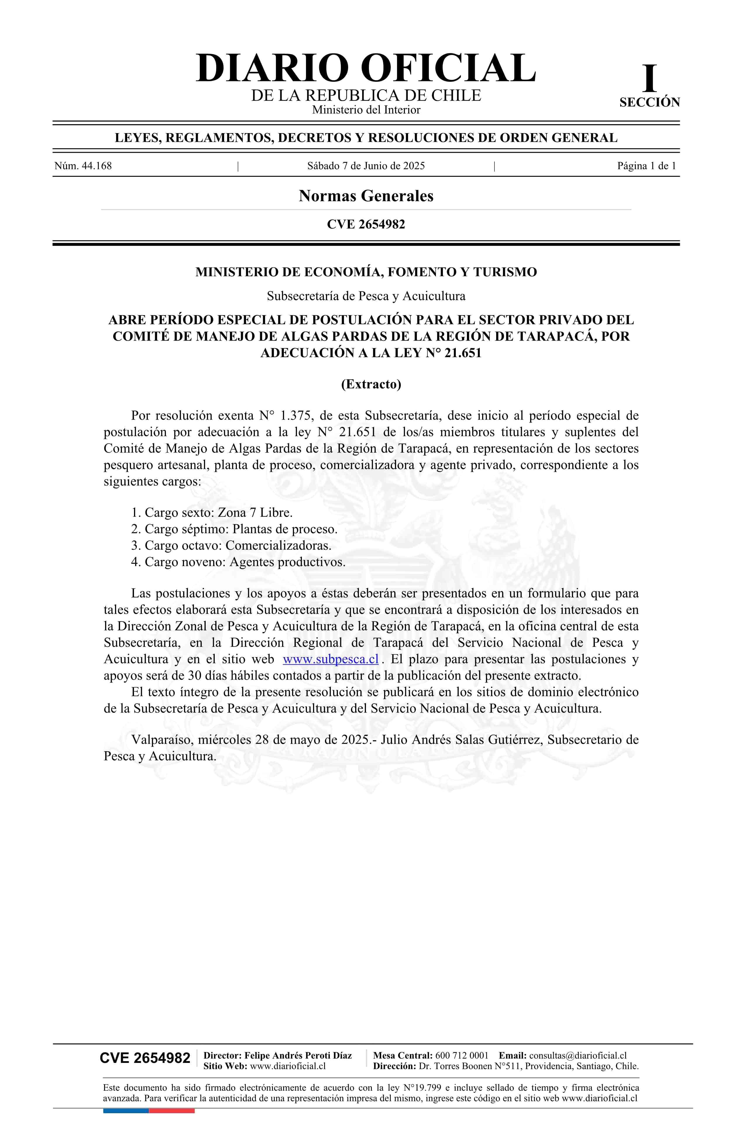 | Título: | Extracto de resolución exenta número 1.375, de 2025.- Abre período especial de postulación para el sector privado del Comité de Manejo de Algas Pardas de la Región de Tarapacá, por adecuación a la ley N° 21.651 |