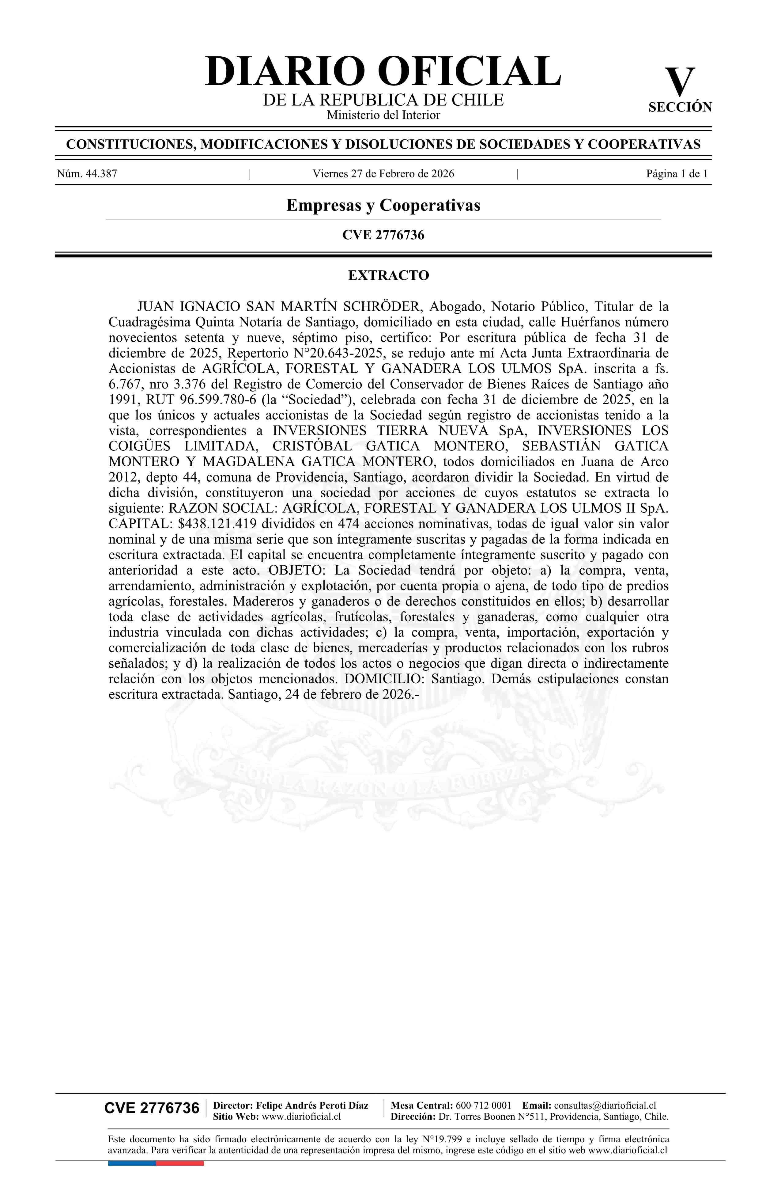 AGRÍCOLA, FORESTAL Y GANADERA LOS ULMOS II SpA 27-02-2026 Diario Oficial Edición Electrónica |