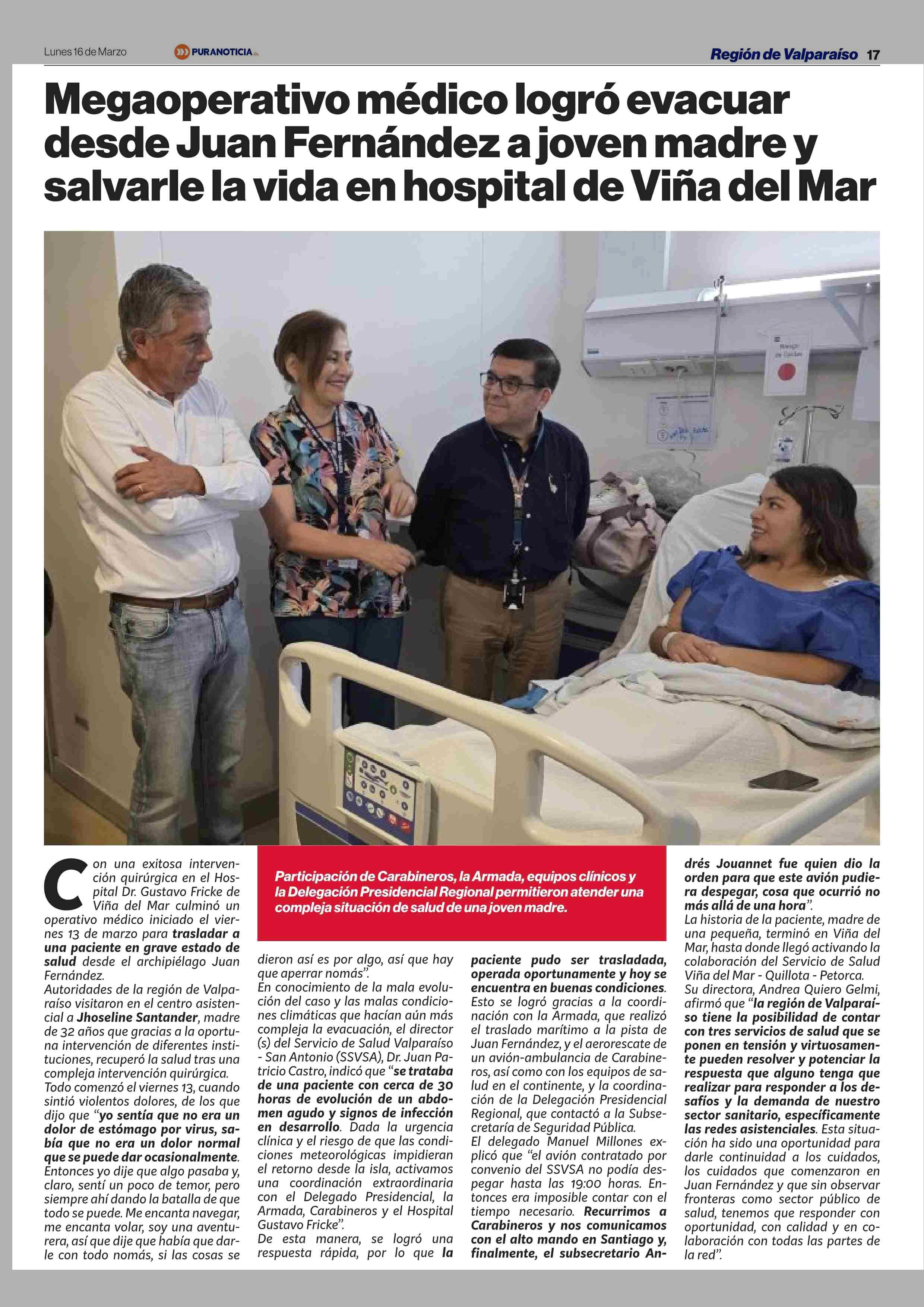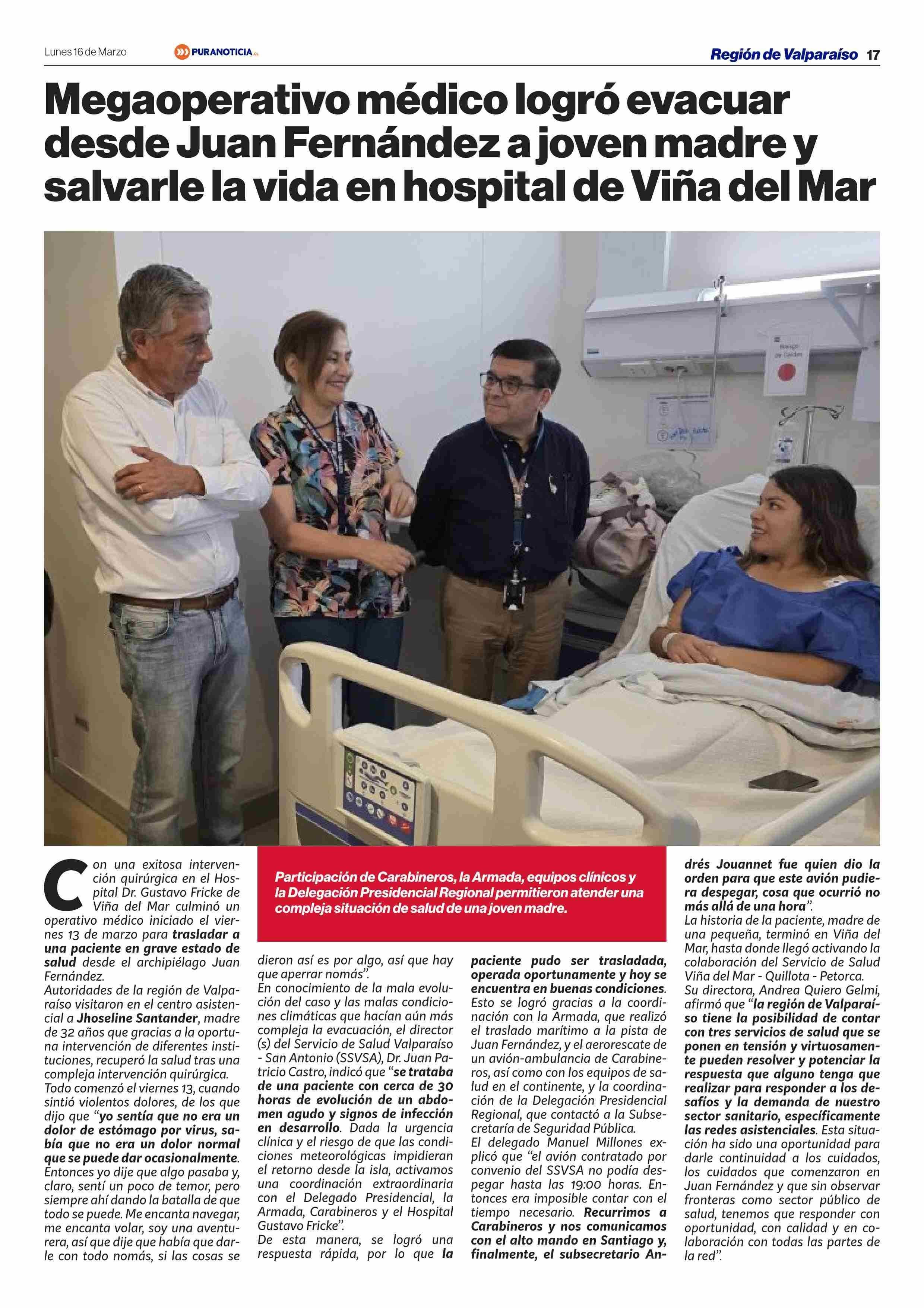 Megaoperativo médico logró evacuar desde Juan Fernández a joven madre y salvarle la vida en hospital de Viña del Mar 16-03-2026 Puranoticia.cl |