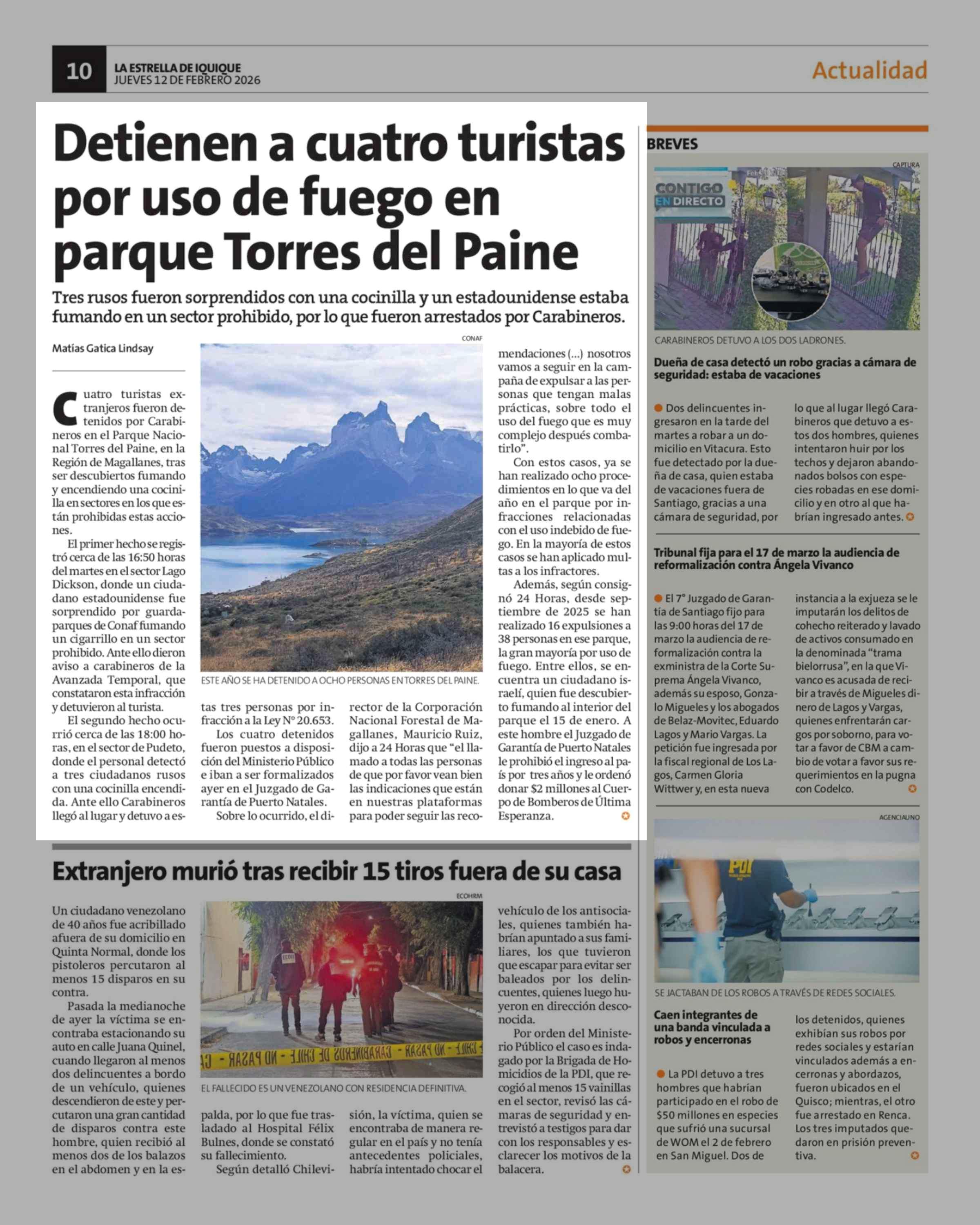 Detienen a cuatro turistas por uso de fuego en parque Torres del Paine 12-02-2026 La Estrella de Iquique |