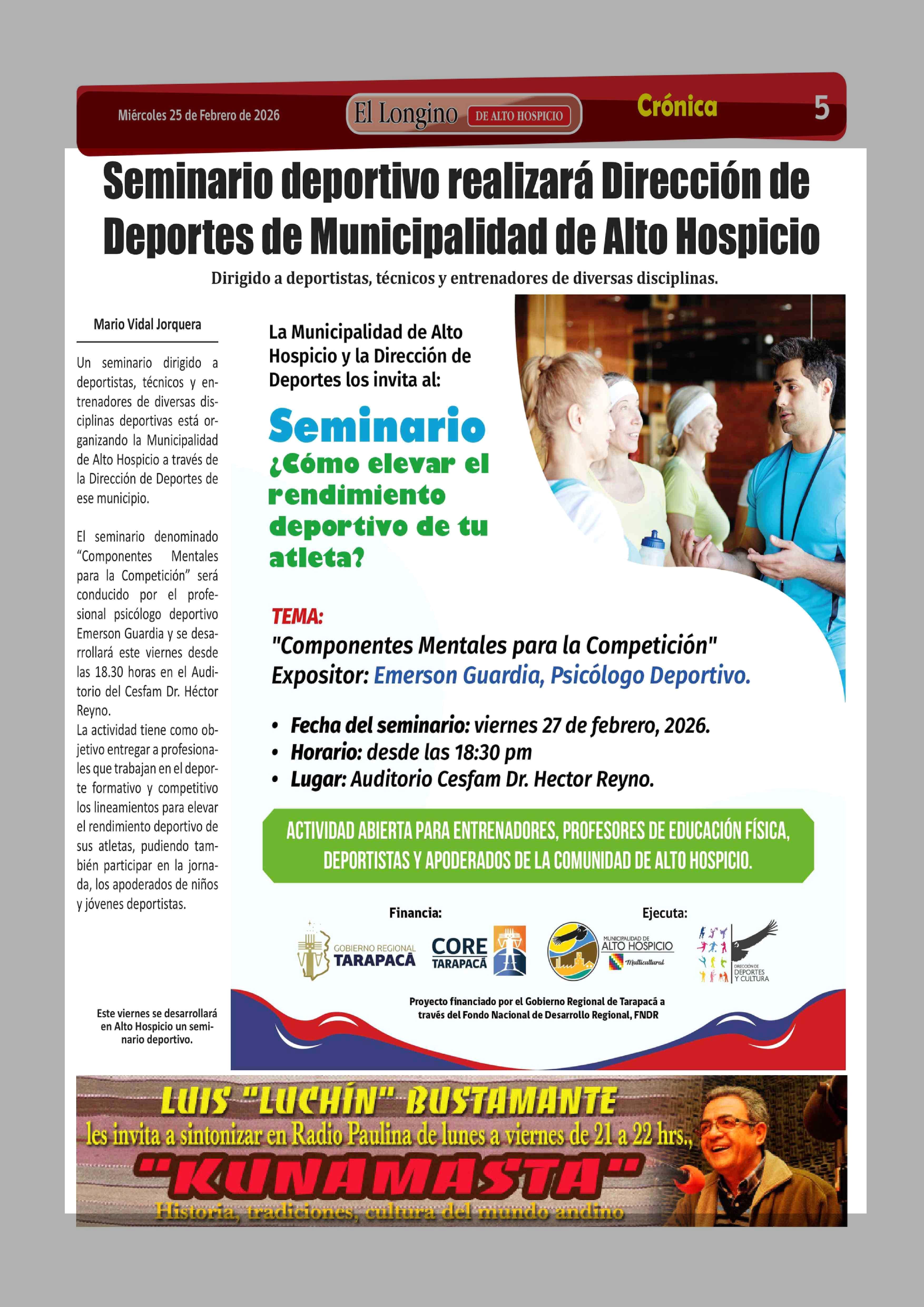 Seminario deportivo realizará Dirección de Deportes de Municipalidad de Alto Hospicio 25-02-2026 El Longino |
