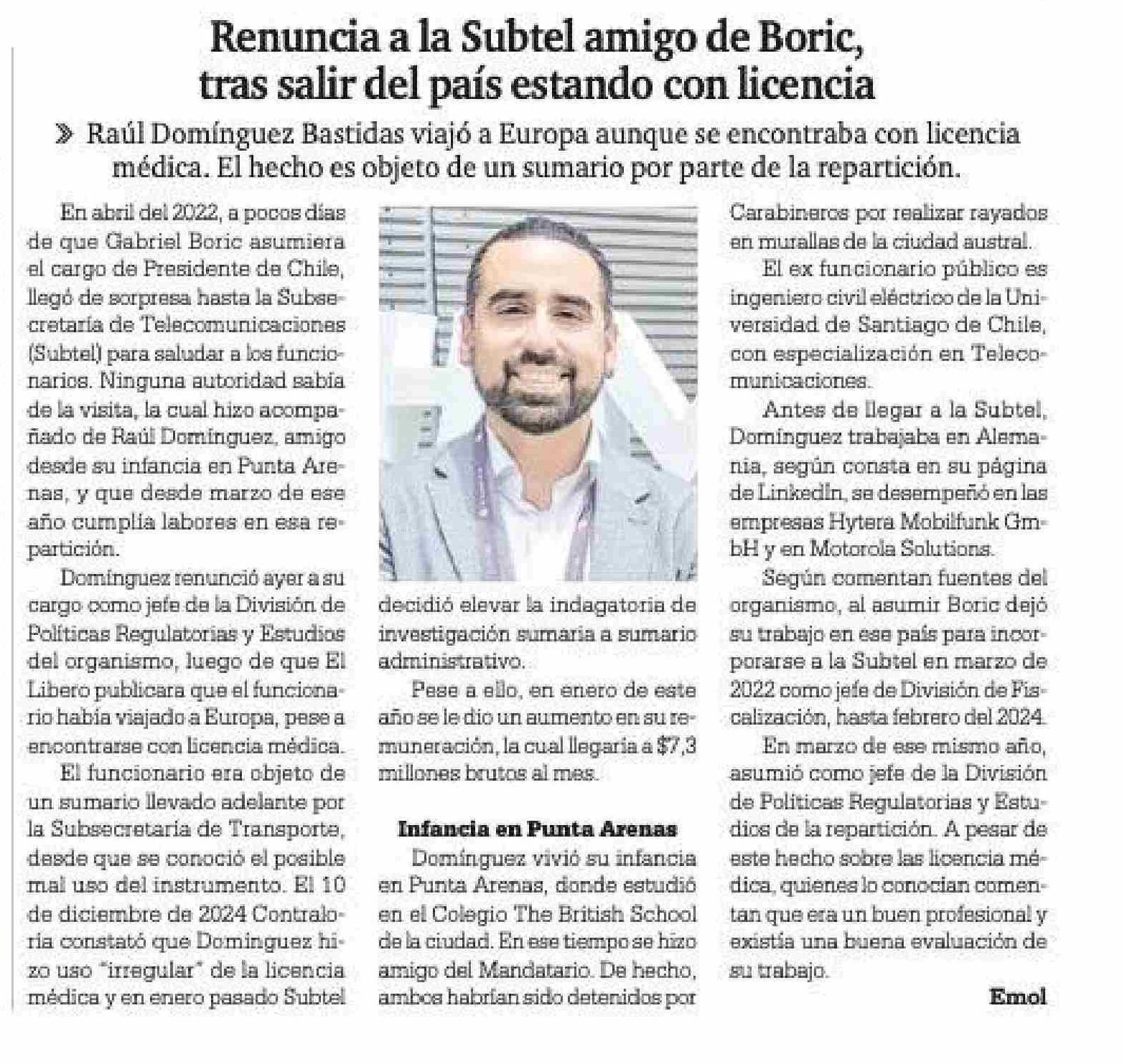 Renuncia a la Subtel amigo de Boric, tras salir del país estando con licencia 24-05-2025 La Prensa Austral |