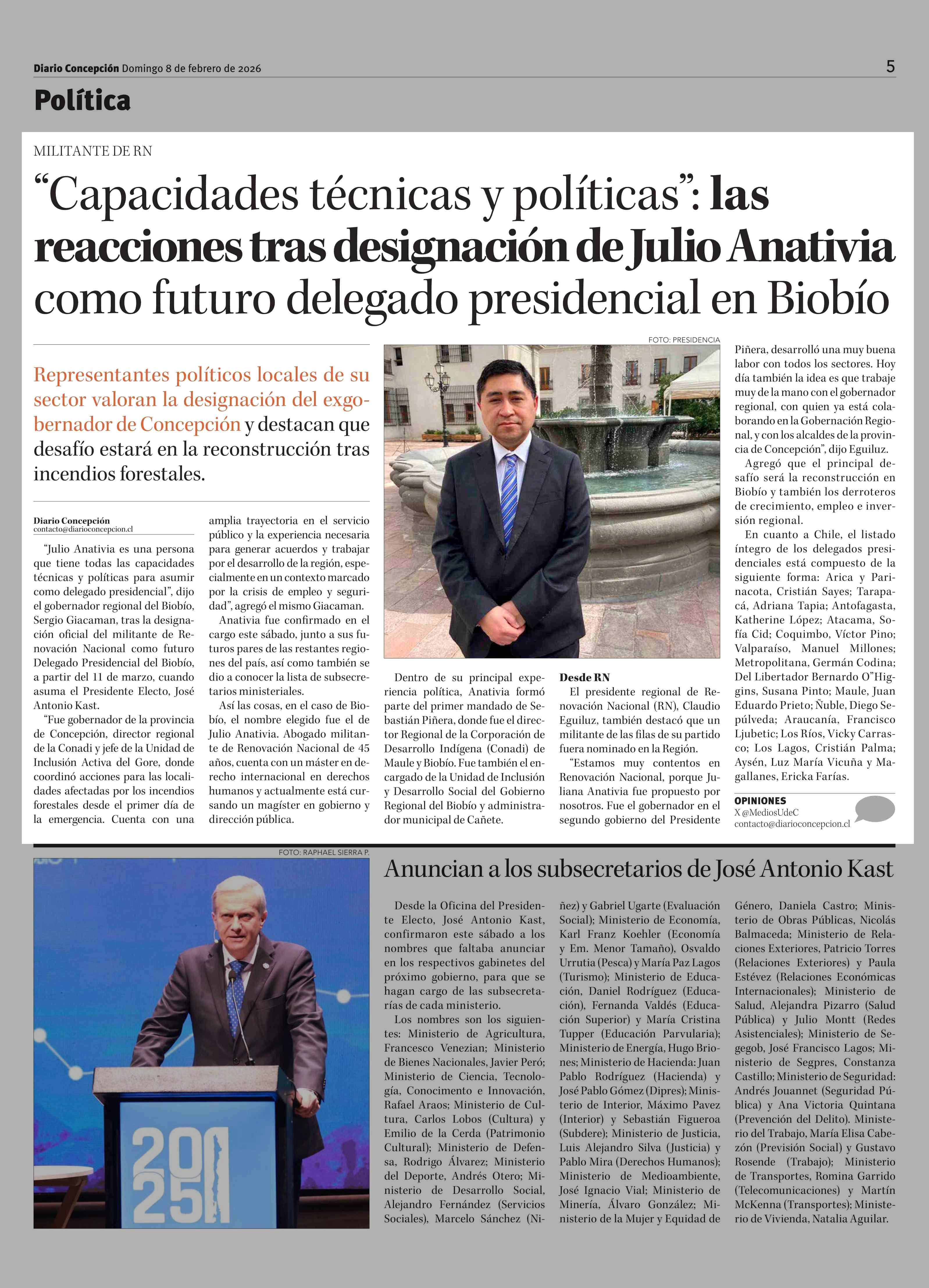 "Capacidades técnicas y políticas": las reacciones tras designación de Julio Anativia como futuro delegado presidencial en Biobío 08-02-2026 Diario Concepción |