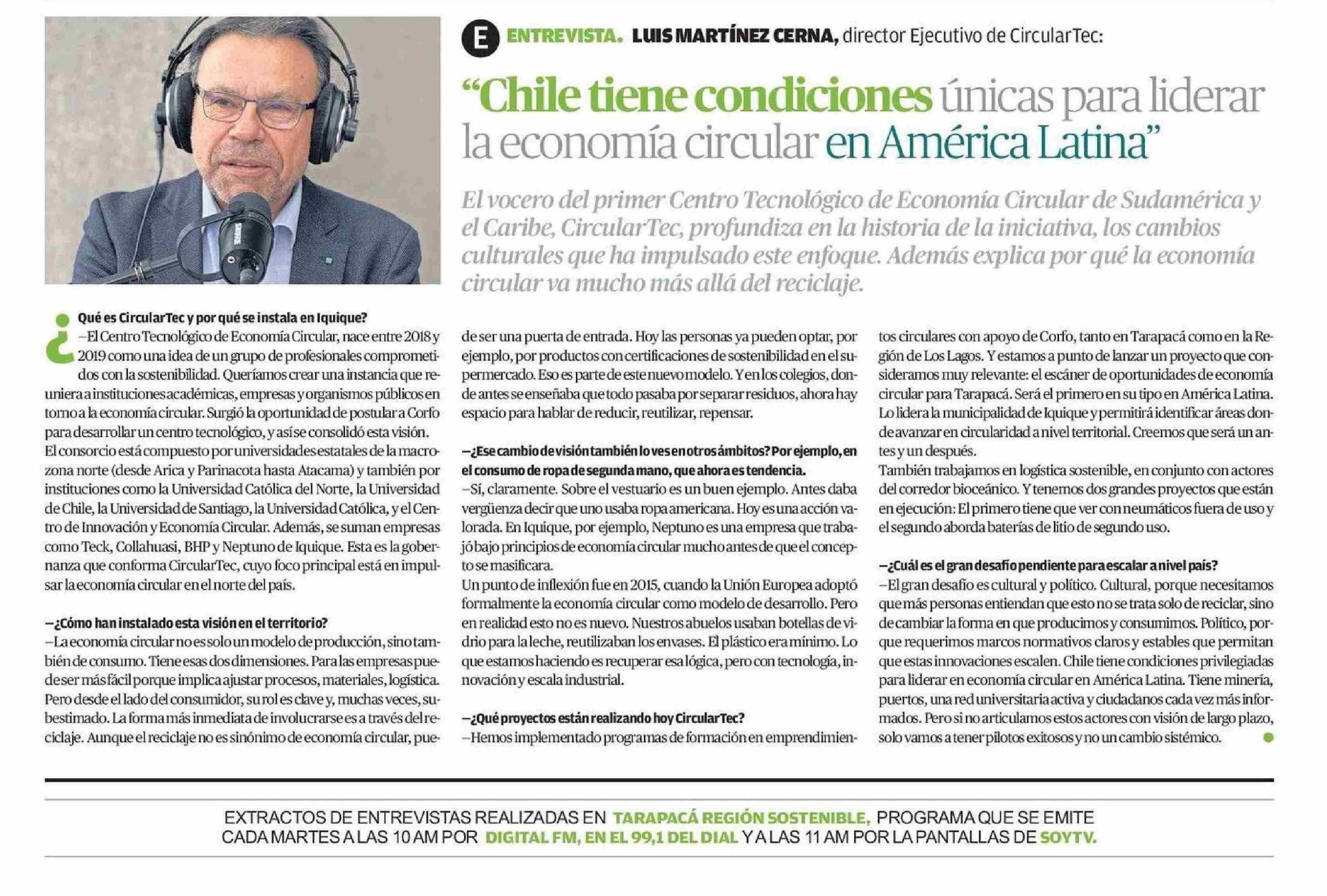 “Chile tiene condiciones únicas para liderar la economía circular en América Latina” 22-06-2025 La Estrella de Iquique |