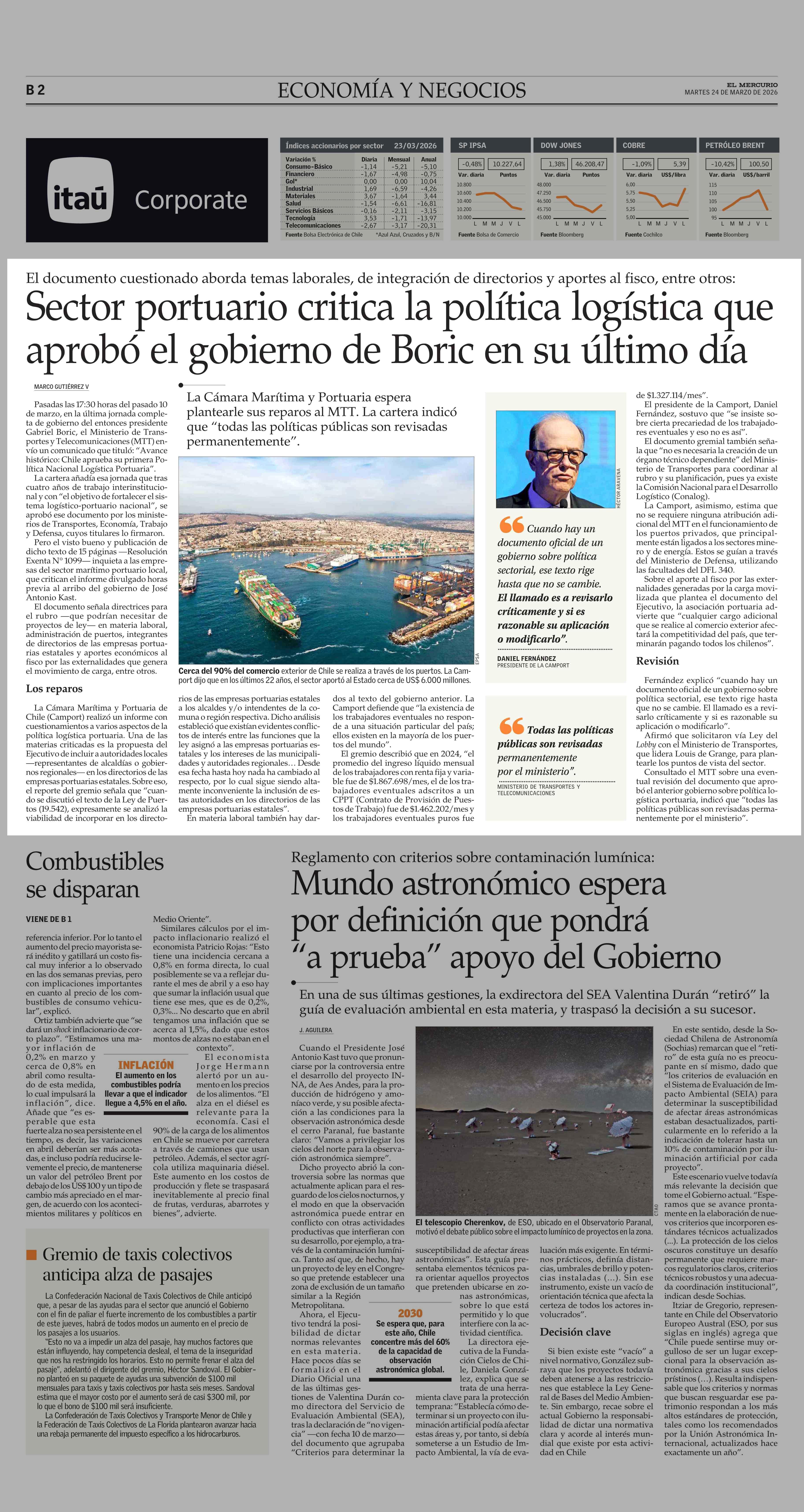 Sector portuario critica la política logística que aprobó el gobierno de Boric en su último día 24-03-2026 El Mercurio |
