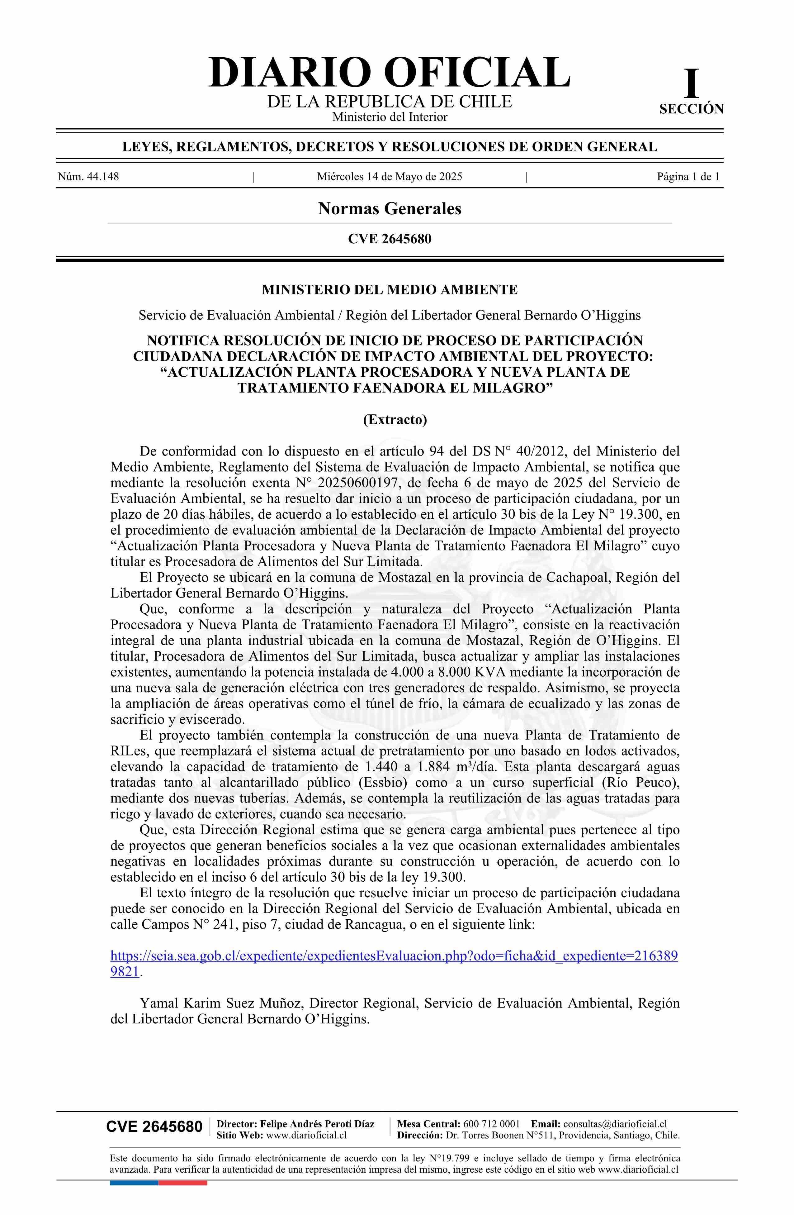 | Título: | Extracto de resolución exenta número 20250600197, de 2025.- Inicia proceso de participación ciudadana en Declaración de Impacto Ambiental del proyecto Actualización Planta Procesadora y Nueva Planta de Tratamiento Faenadora El Milagro |