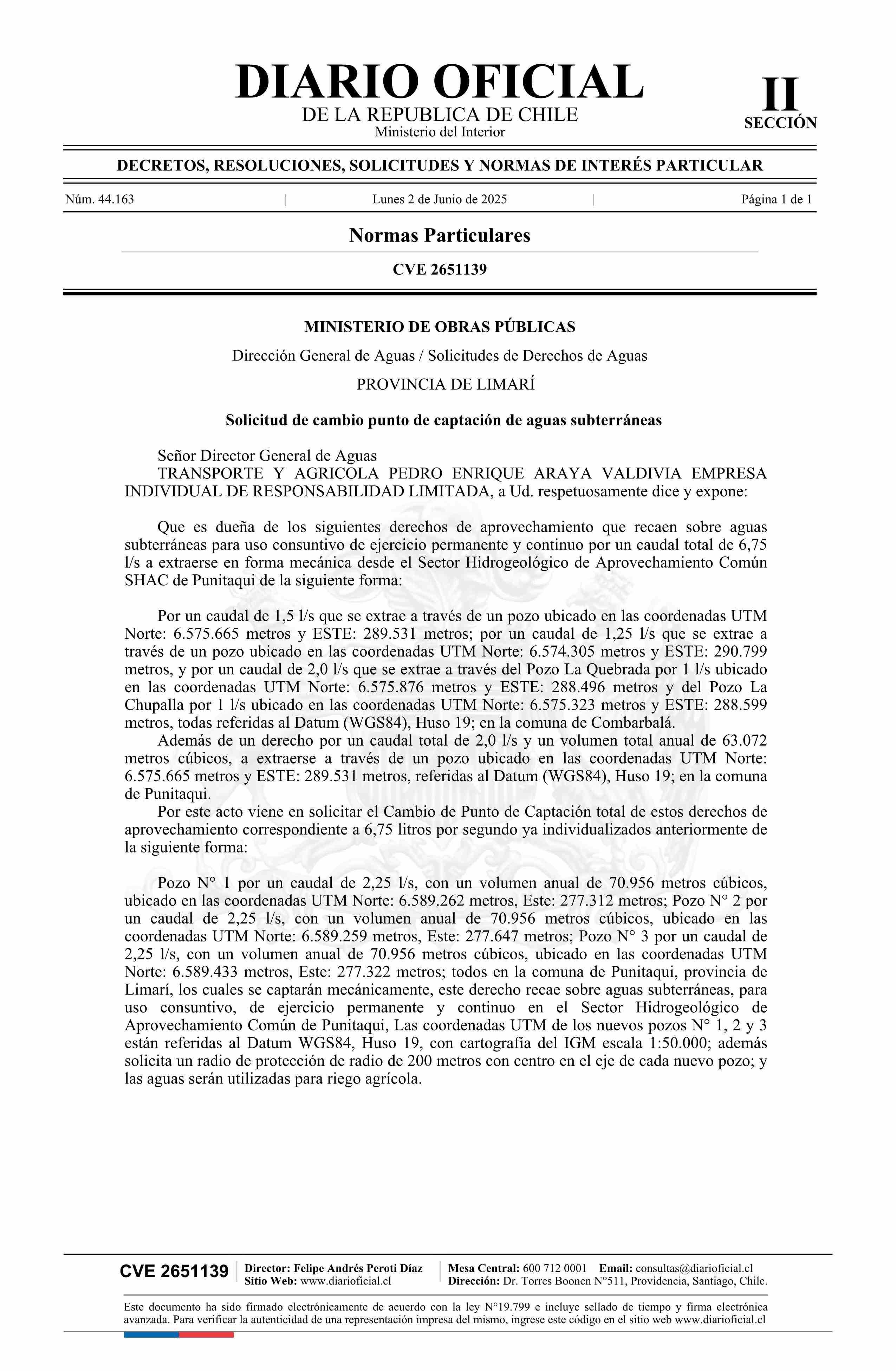 Solicitud Transporte y Agrícola Pedro Enrique Araya Valdivia Empresa Individual de Responsabilidad Limitada 02-06-2025 Diario Oficial Edición Electrónica |